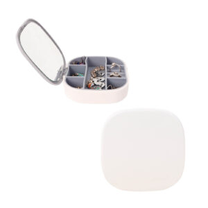 Organizador de joyas, cuenta con 6 compartimentos para accesorios, 3 ranuras para anillos y 1 espejo en la parte interior....
