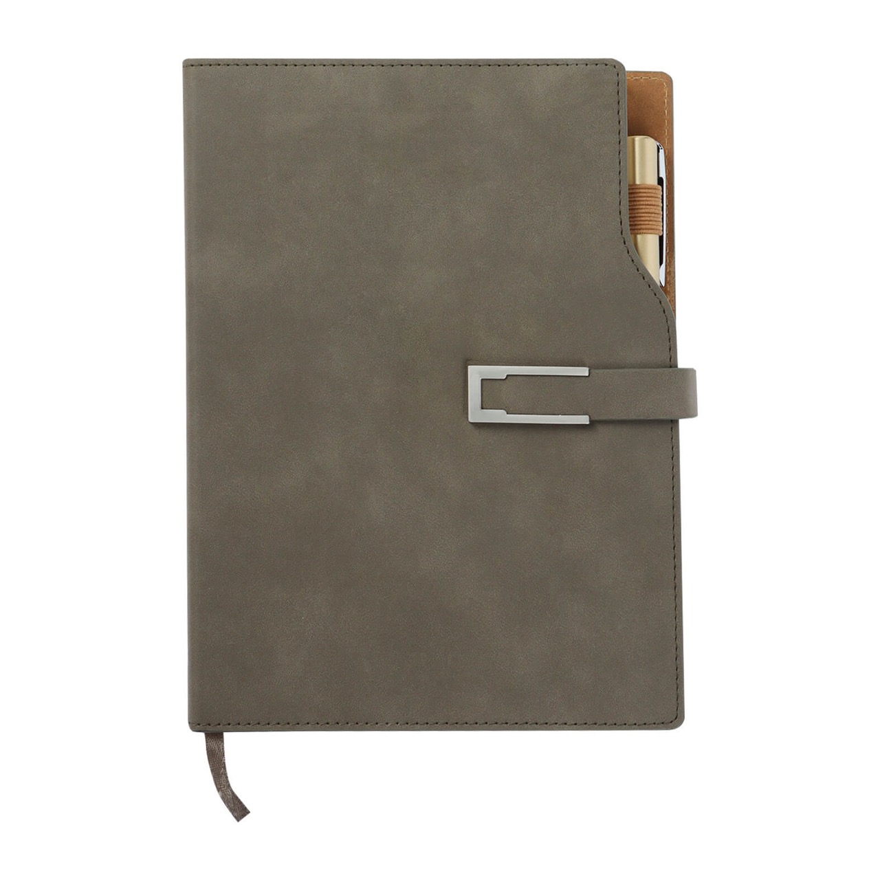 Agenda diaria con calendario de 2024 a 2028, 120 hojas, separador y broche magnético. Dentro de sus apartados contiene: datos personales, teléfonos de emergencia y festividades personales. Incluye bolígrafo.