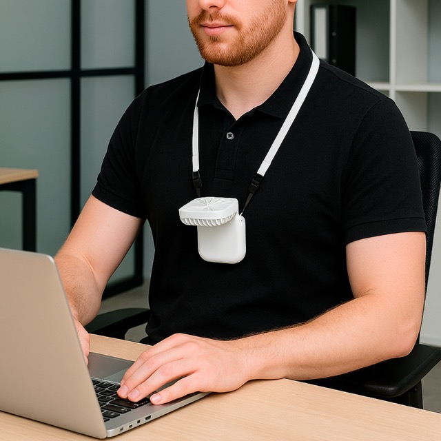 Ventilador plegable y recargable. Cuenta con tres velocidades y correa para cuello con puerto de carga tipo micro USB.