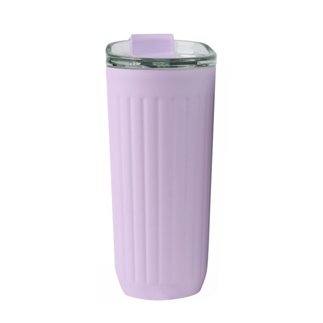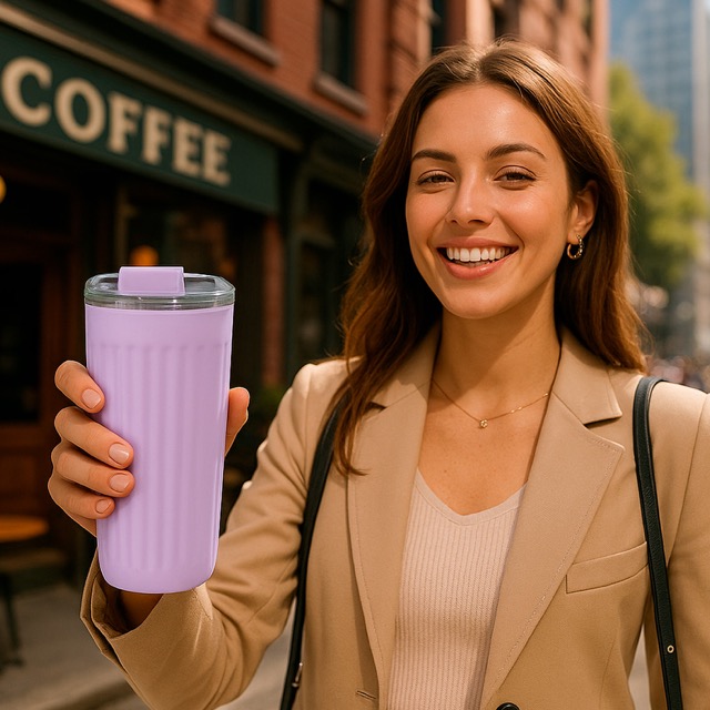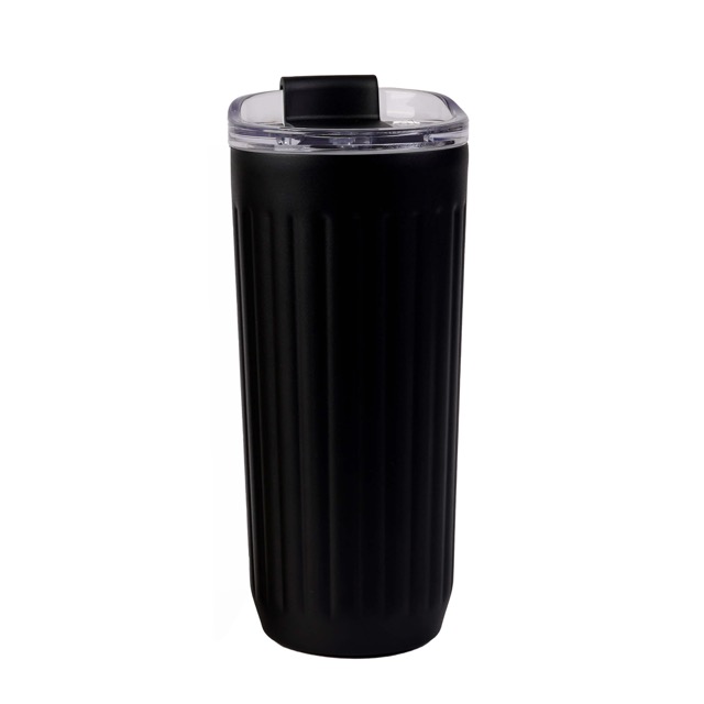 Termo con doble pared de acero inoxidable con acabado rugoso, insaldao al vacio, tapa que cierra a presión y boquilla de seguridad.
