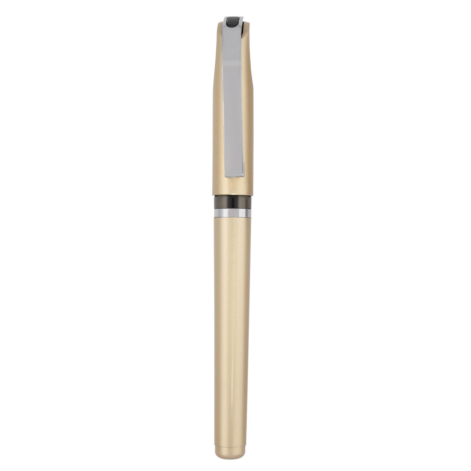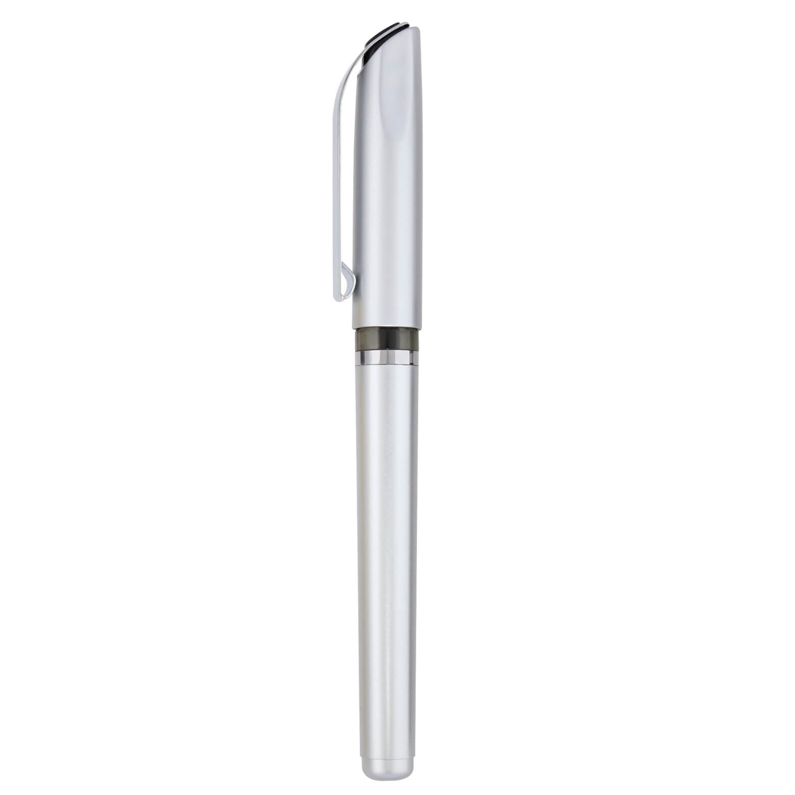 Bolígrafo de plástico con apariencia metálica, tinta gel y clip metálico.