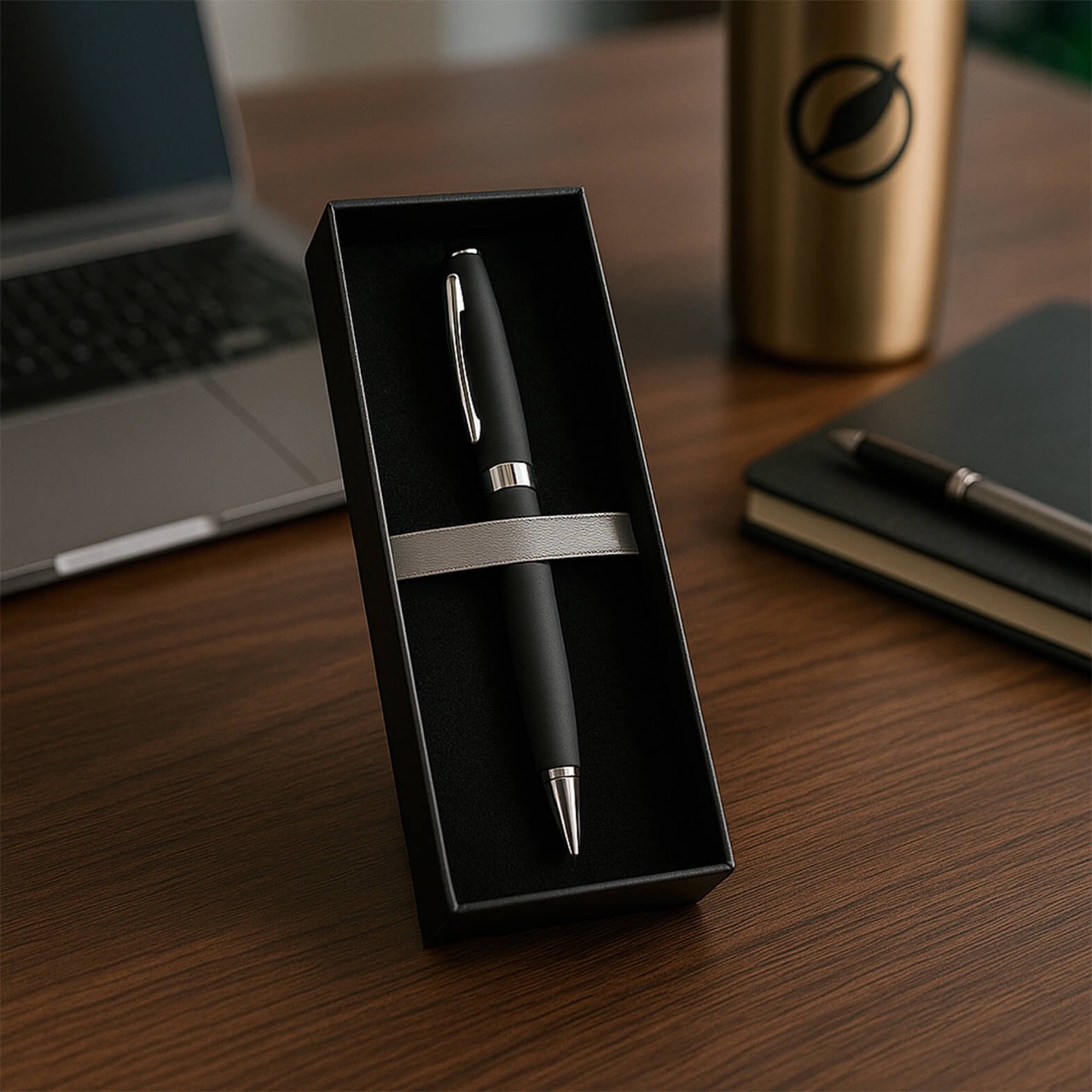 Bolígrafo metálico con acabado rubber, clip y mecanismo retráctil. Incluye caja.