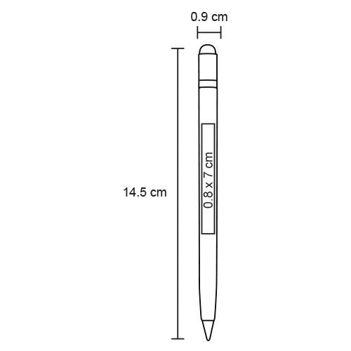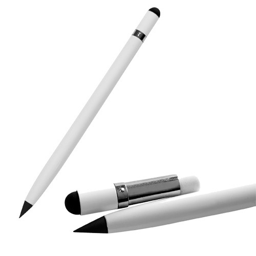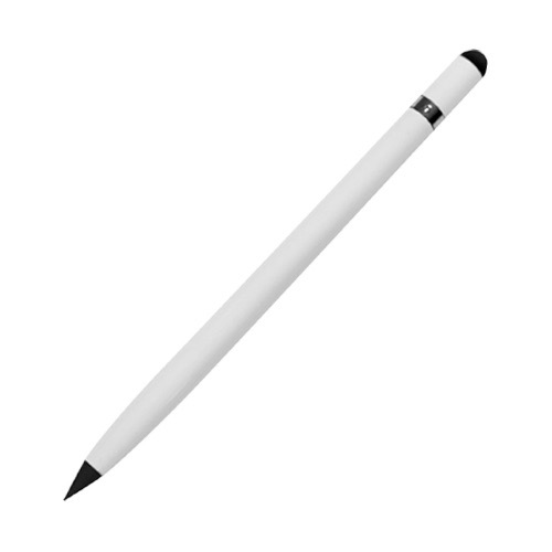 Bolígrafo libre de tinta con goma y touch screen. El trazo gris simula la línea de un lápiz, cuenta con una aleación de metales entre el estaño y bismuto, que al contacto con la hoja y la fuerza aplicada hace una reacción química de oxidación, no deja manchas y es posible borrarlo con una goma regular, la cual está incluída al destapar la parte superior del bolígrafo.