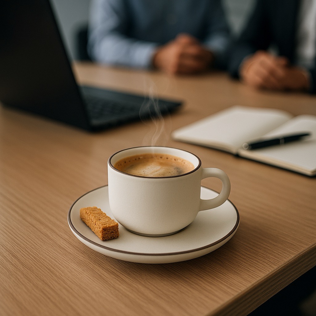 Taza y plato de cerámica con acabado mate.