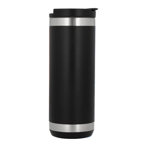 Termo de acero inoxidable de doble pared insulado al vacío con acabado rugoso tapa enroscable con cierre de seguridad.