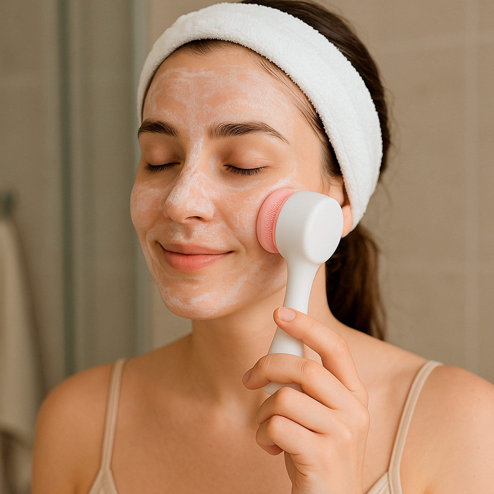 Cepillo limpiador facial de doble cara con mango ergonómico.
