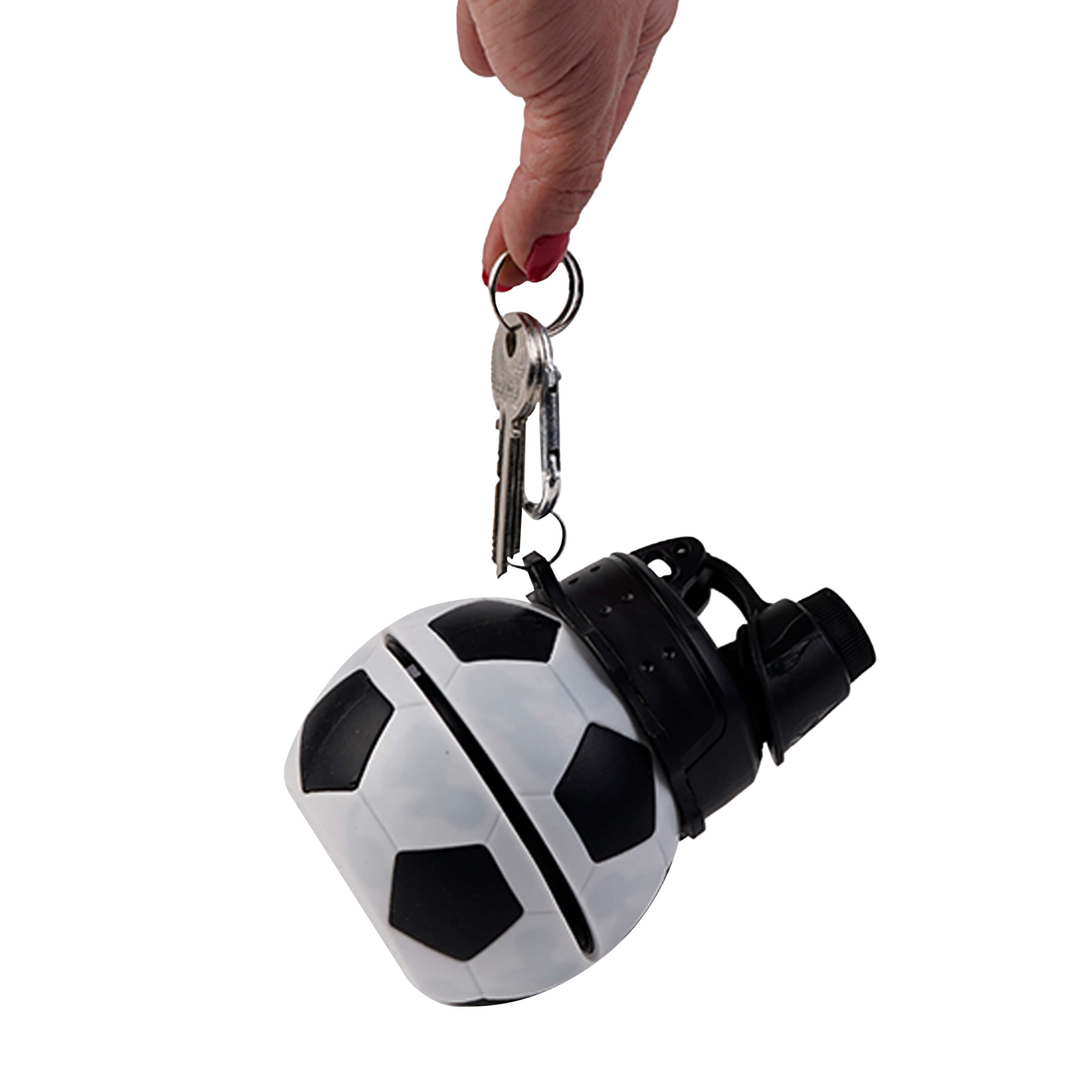 Cilindro de silicón con forma de balón de futbol que se extiende y contrae, cuenta con tapa enroscable, boquilla con tapa de seguridad en la parte superior y seguro para mejor sujeción.