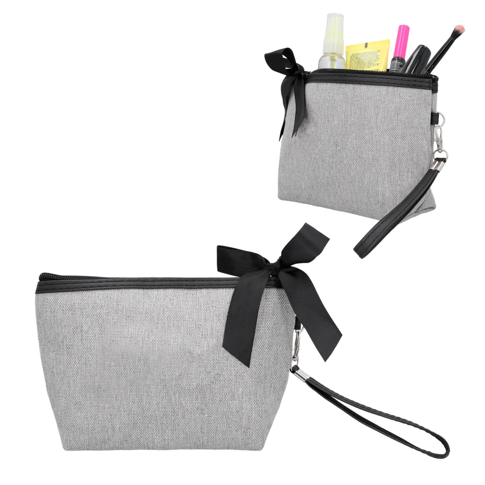 Cosmetiquera con forro, cierre superior y correa.