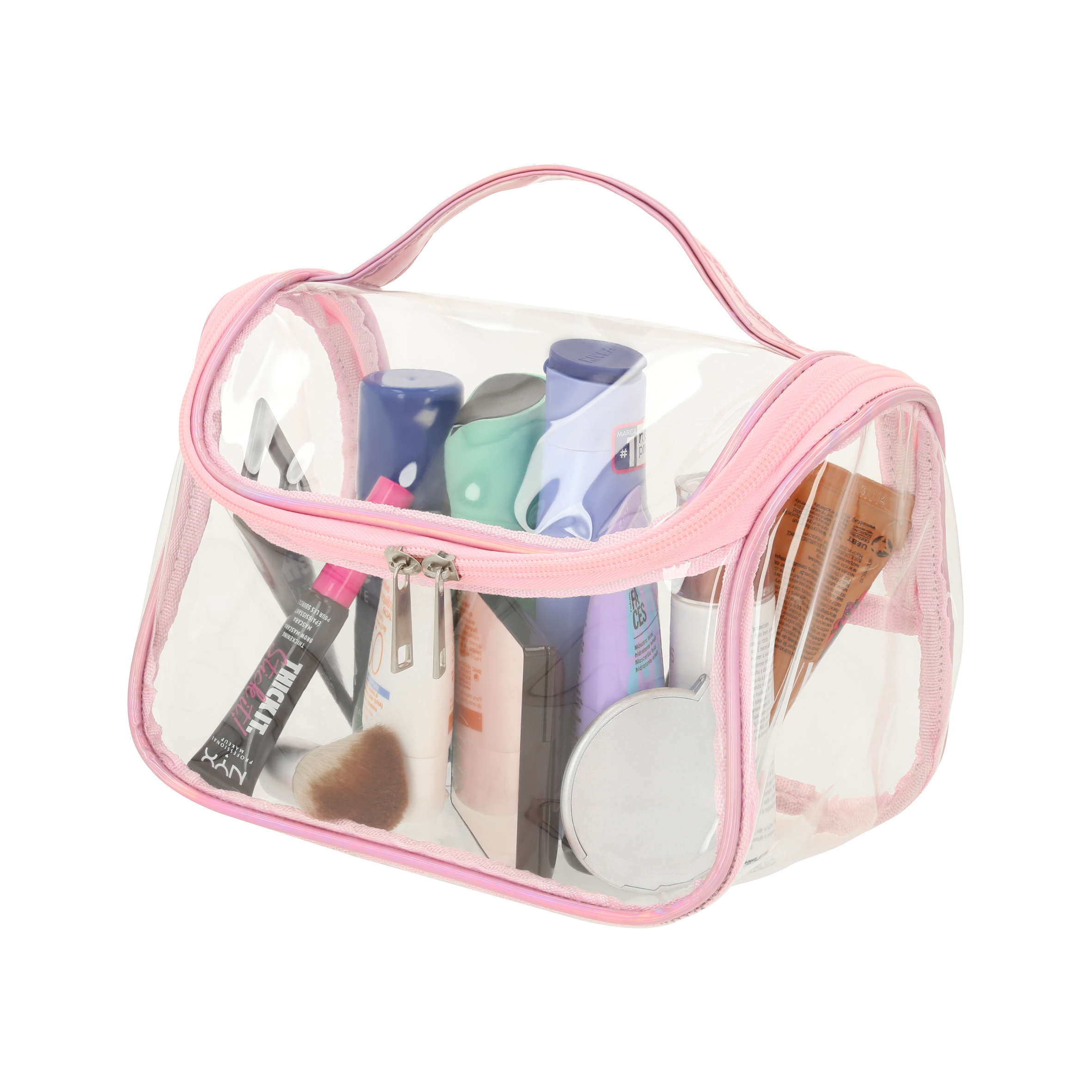 Cosmetiquera de plástico transparente, costuras en color rosa, doble cierre y asa.