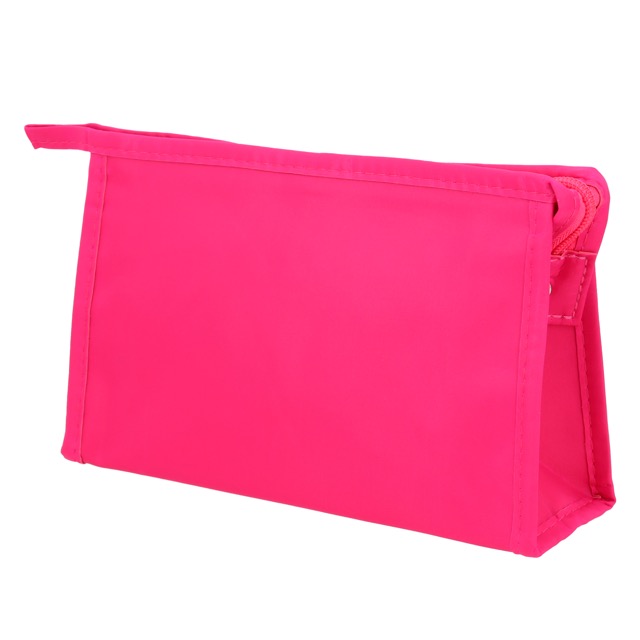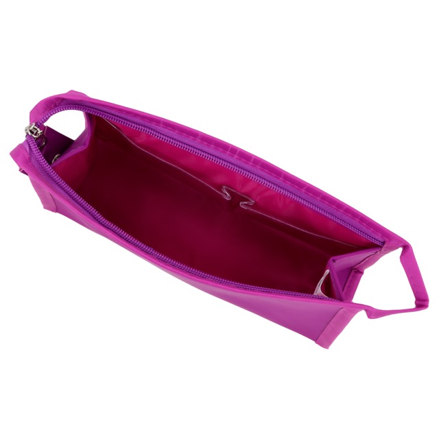 Cosmetiquera de poliéster con cierre superior, bolsa interior y dos compartimentos.