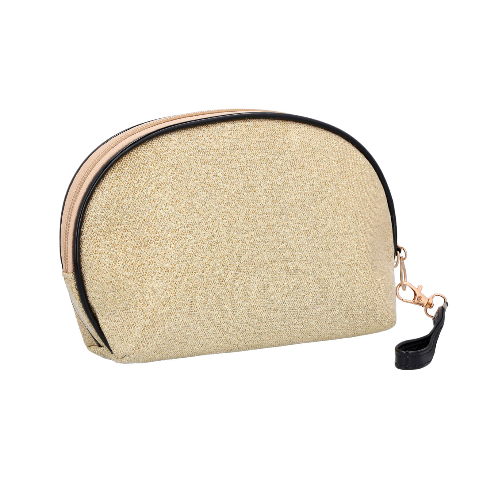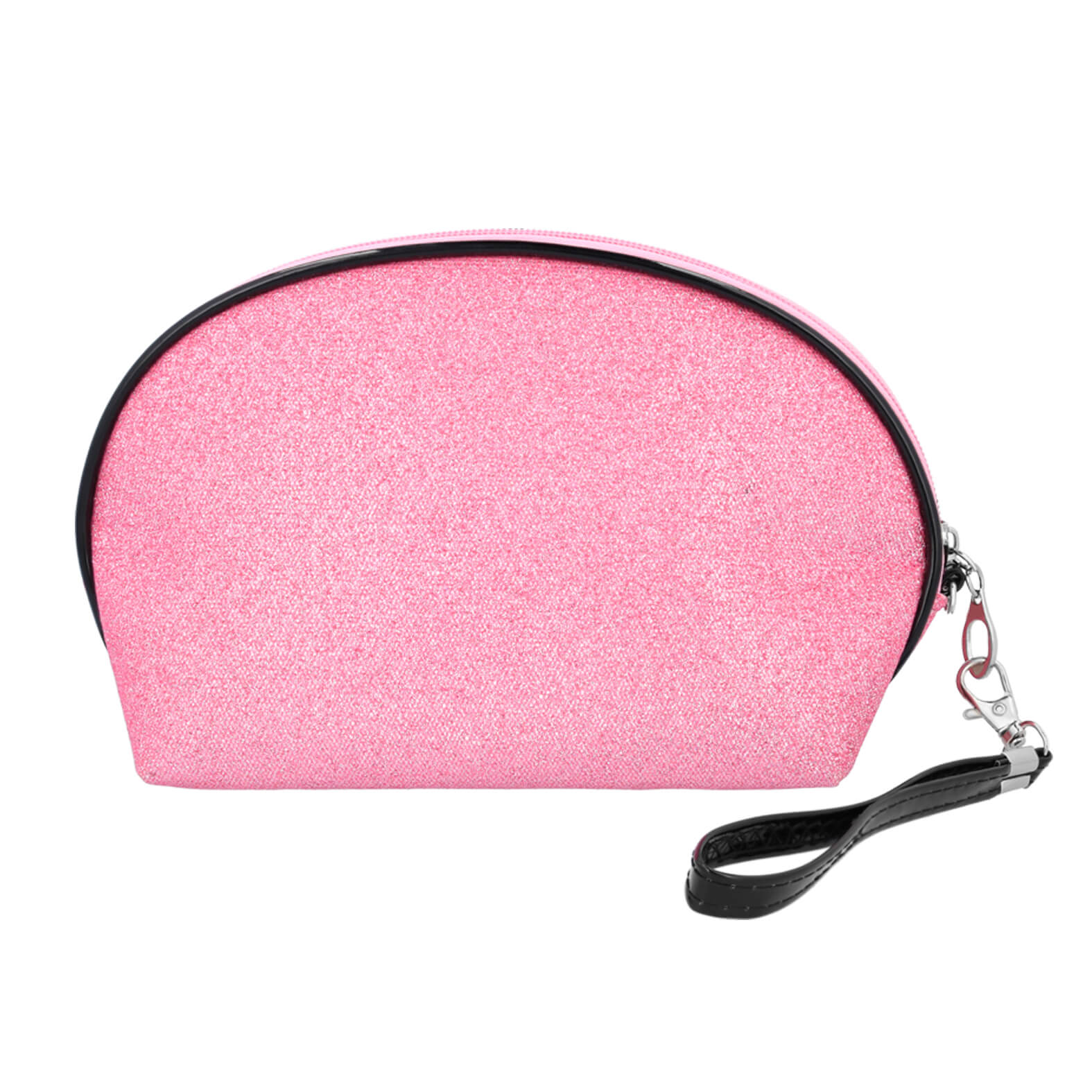 Cosmetiquera de poliéster con acabado glitter, cierre, orilla y correa de plástico intercambiable de 15.2 x 1.2 cm.