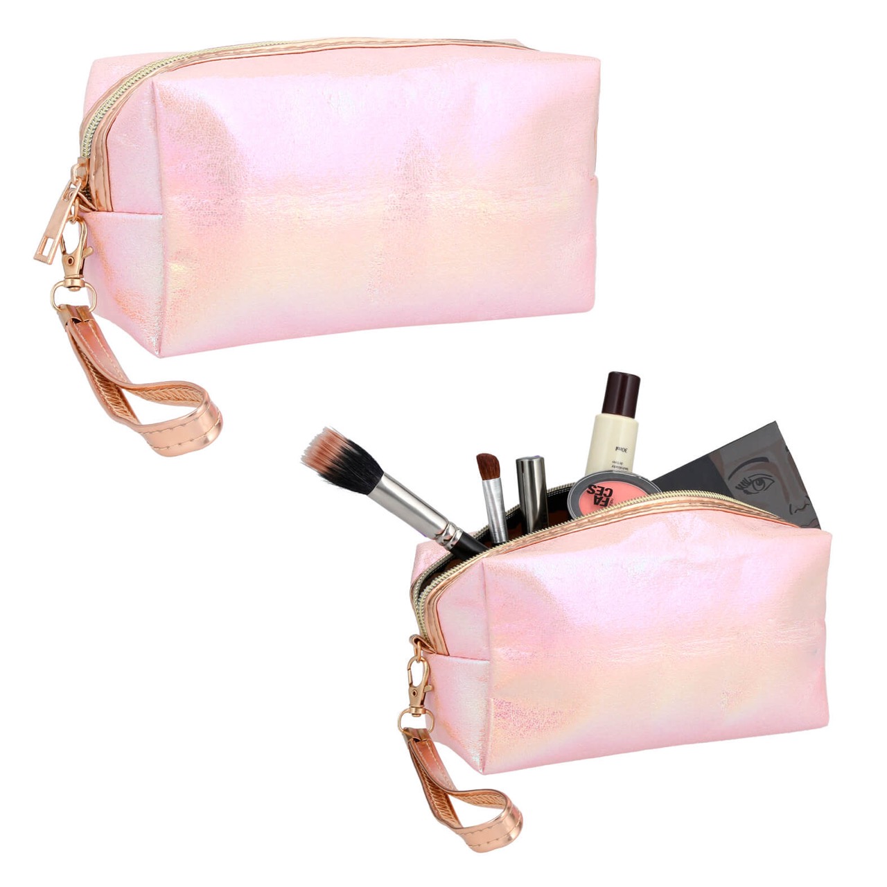 Cosmetiquera con acabado glitter, cierre y correa de plástico intercambiable.