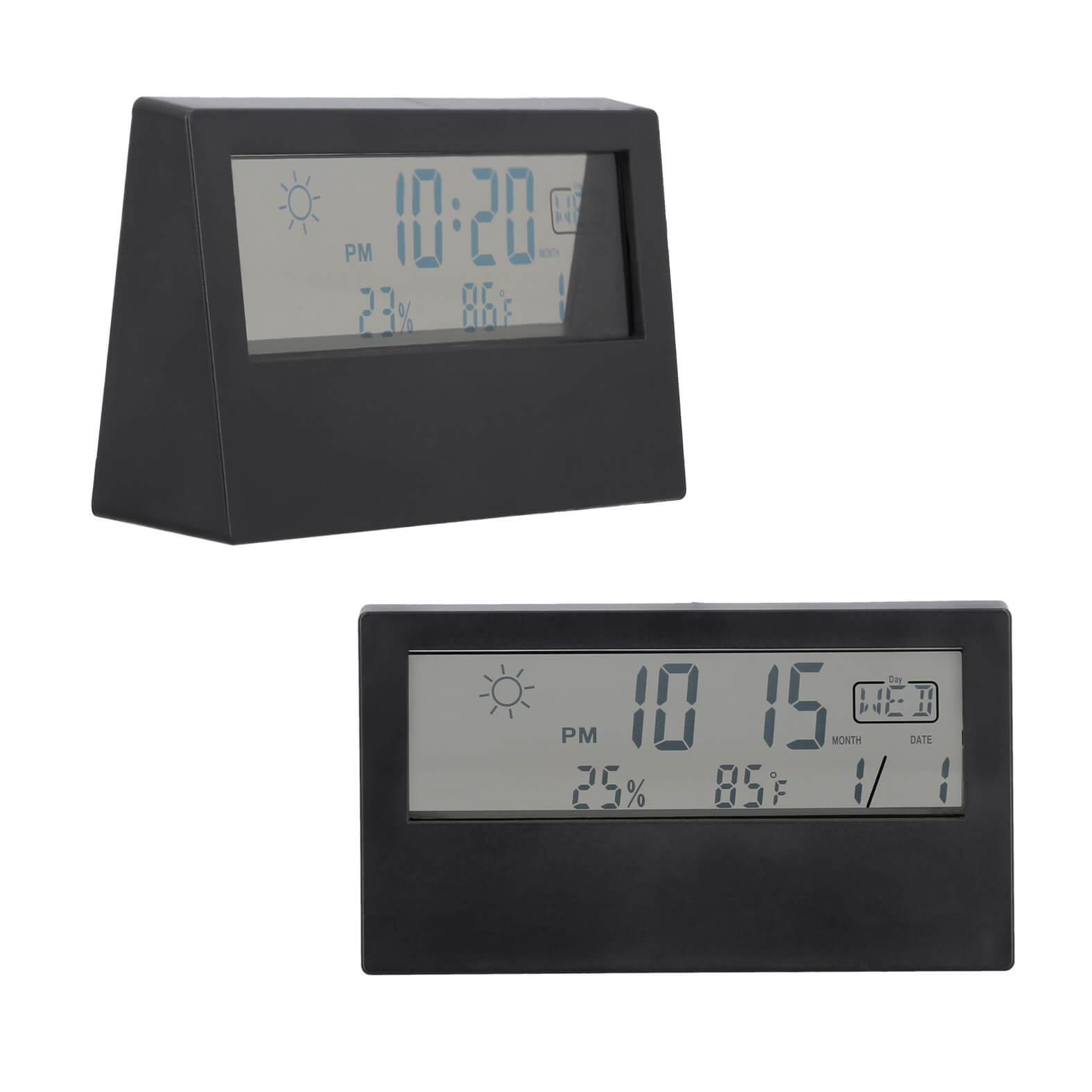 Reloj digital con despertador, medidor de temperatura, día, mes y año. Incluye baterias.