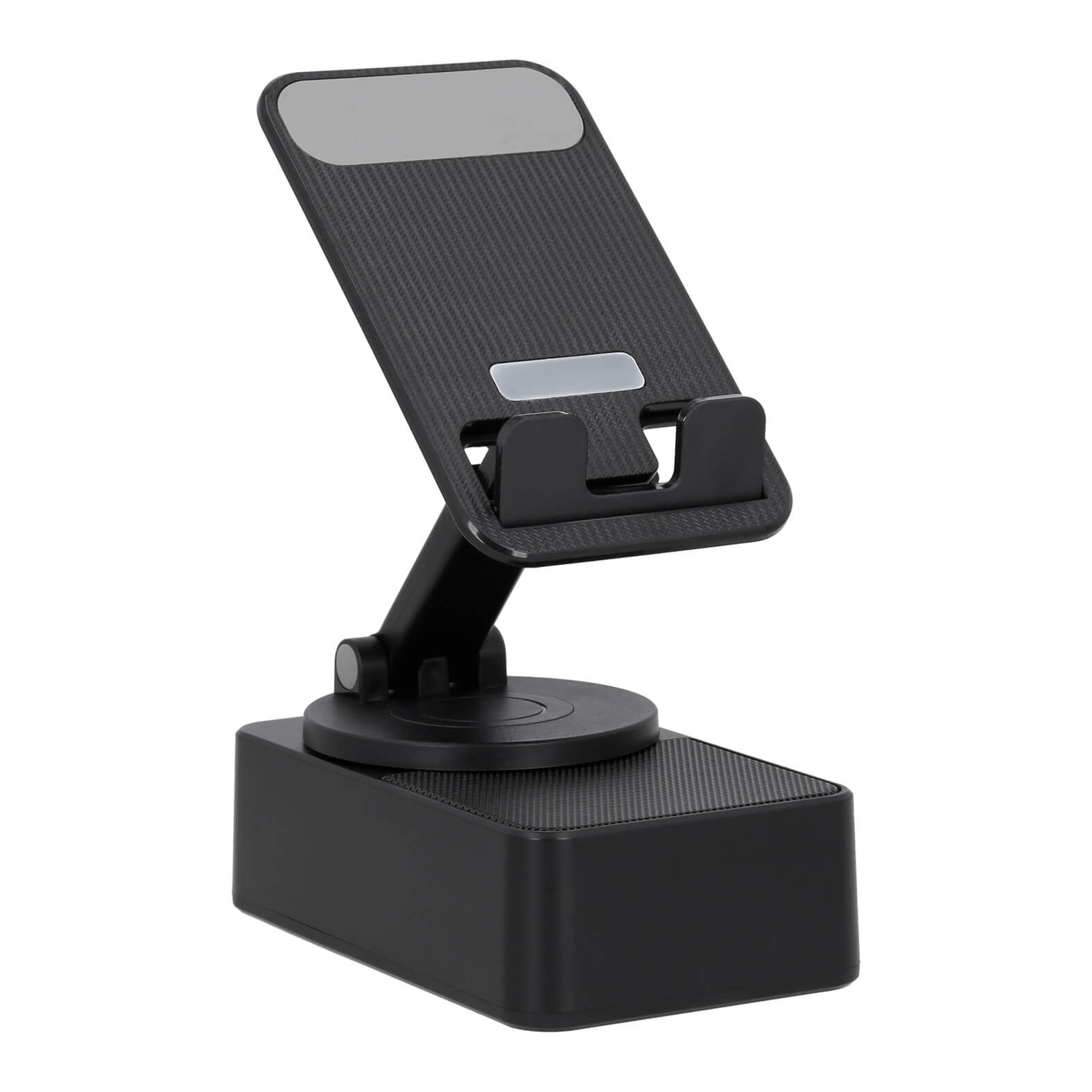 Bocina bluetooth portátil con soporte para celular plegable, luz RGB de 7 colores y con entrada USB. Incluye cable de carga tipo C.