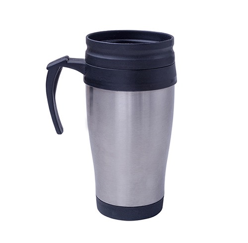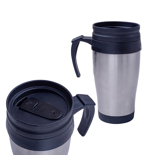 Termo de acero inoxidable con interior de plástico, incluye tapa con rosca que evita derrames y boquilla de seguridad.
