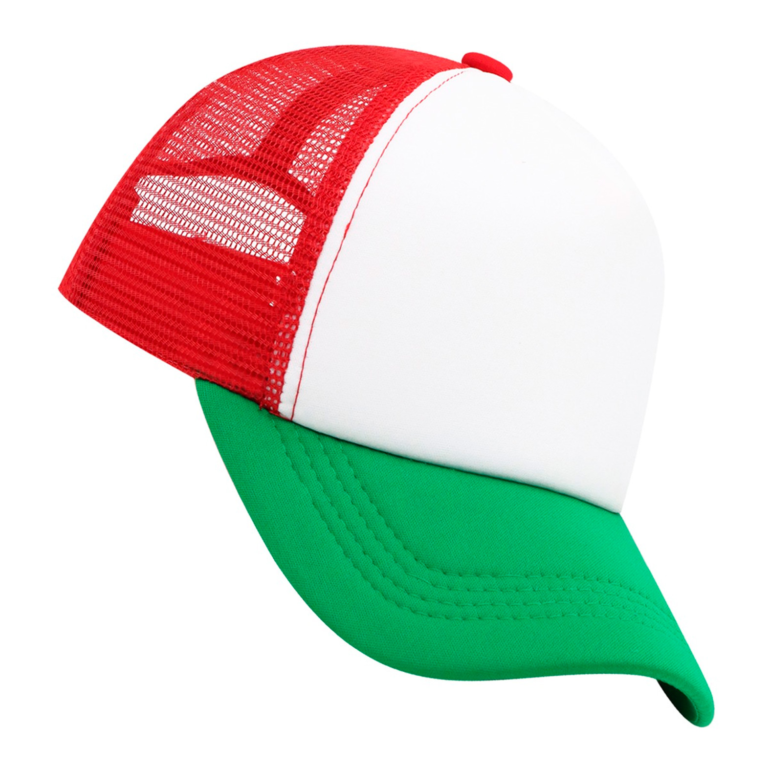 Gorra tricolor con malla de 6 gajos y broche snapback.