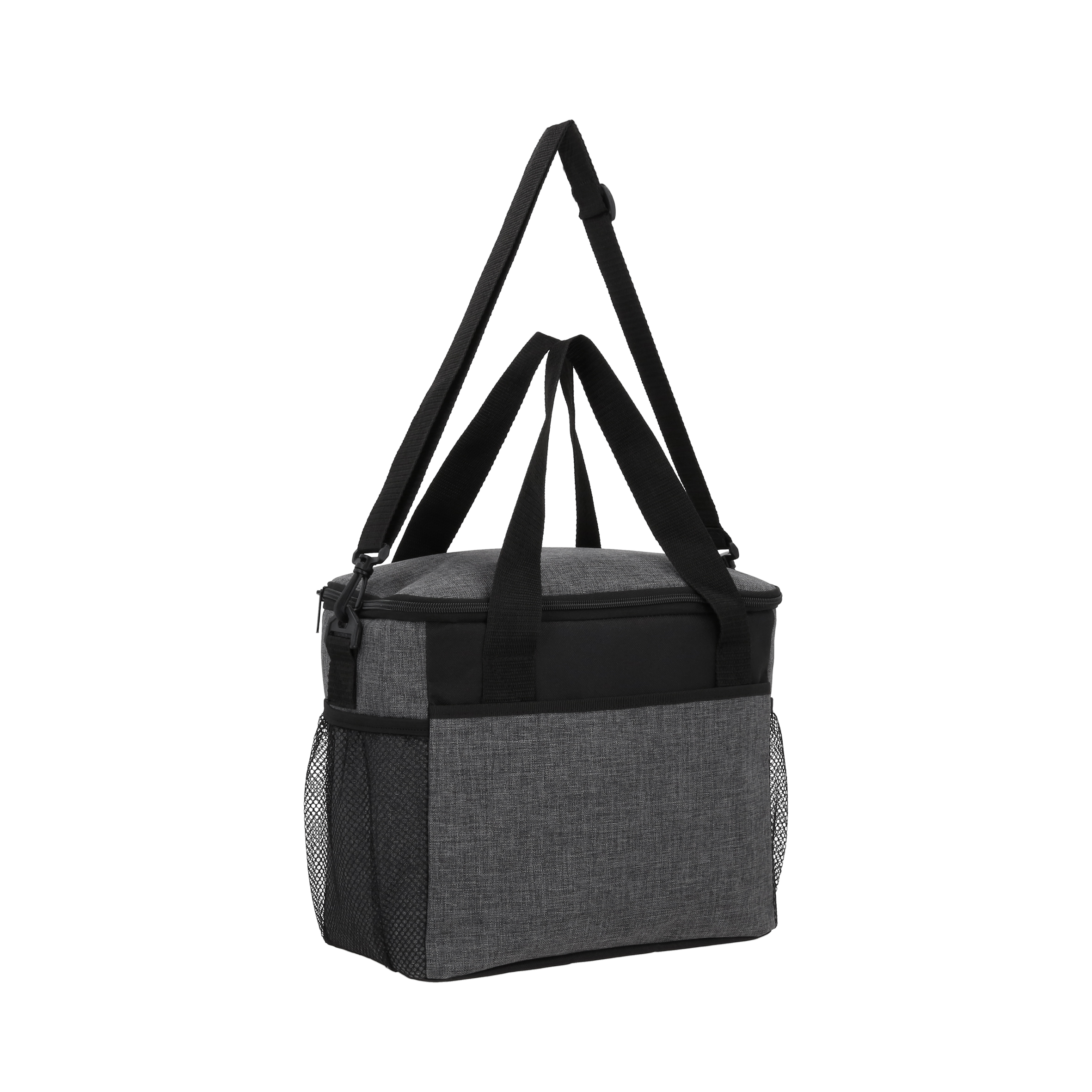 Hielera rectangular con interior impermeable plastificado con cierre, 2 asas, 2 mallas laterales, compartimento frontal y correa ajustable.