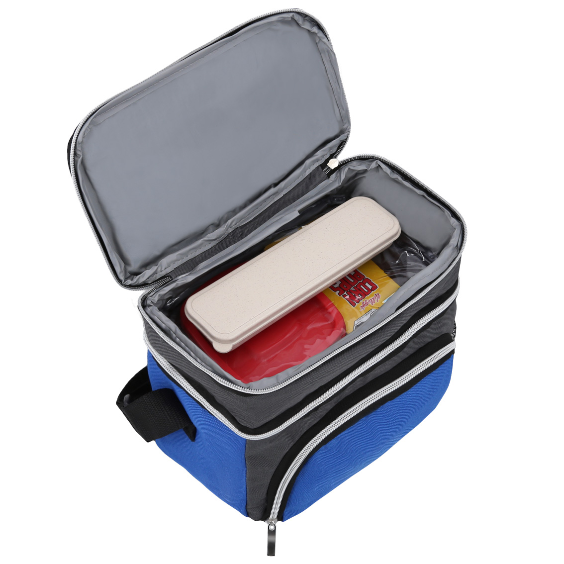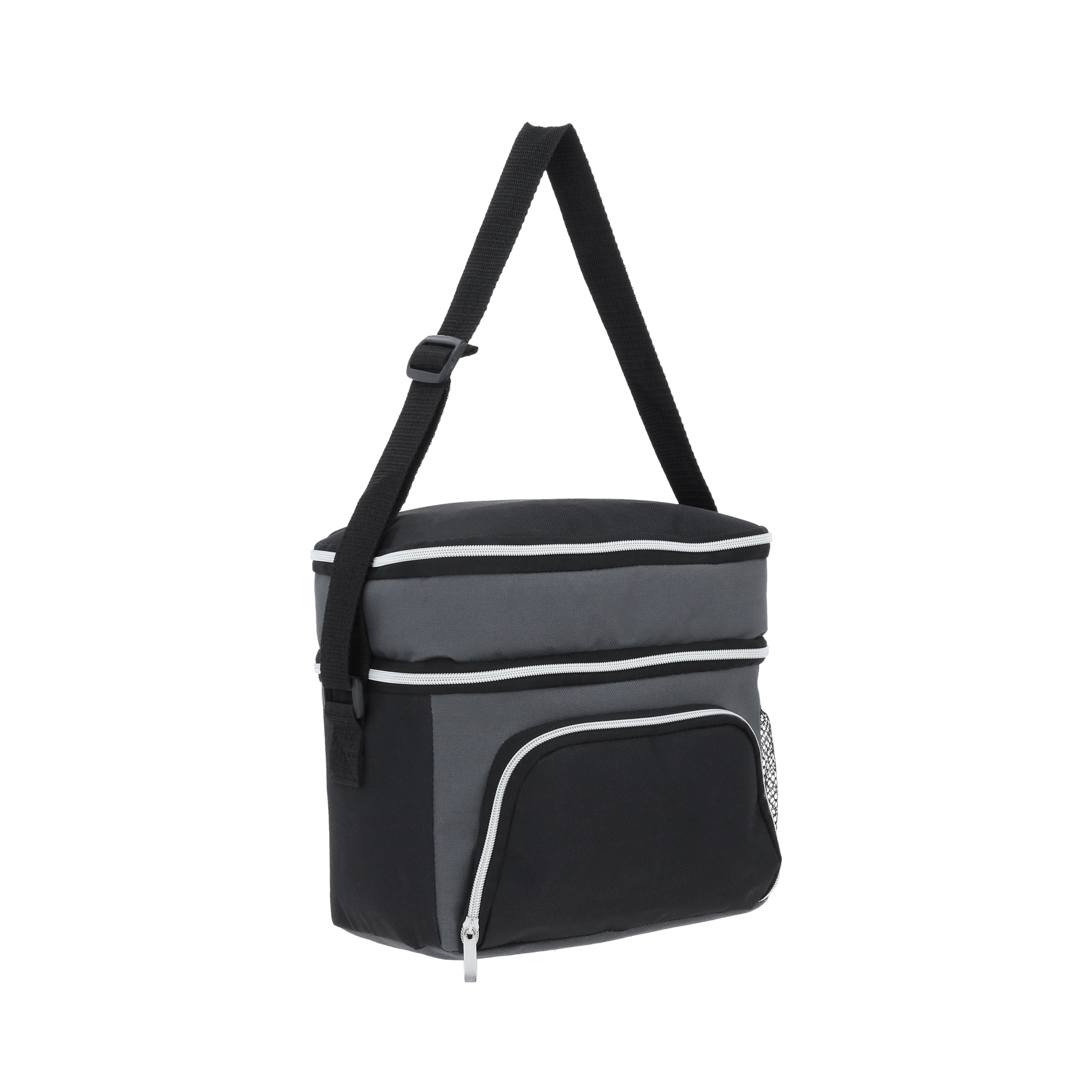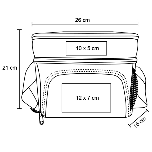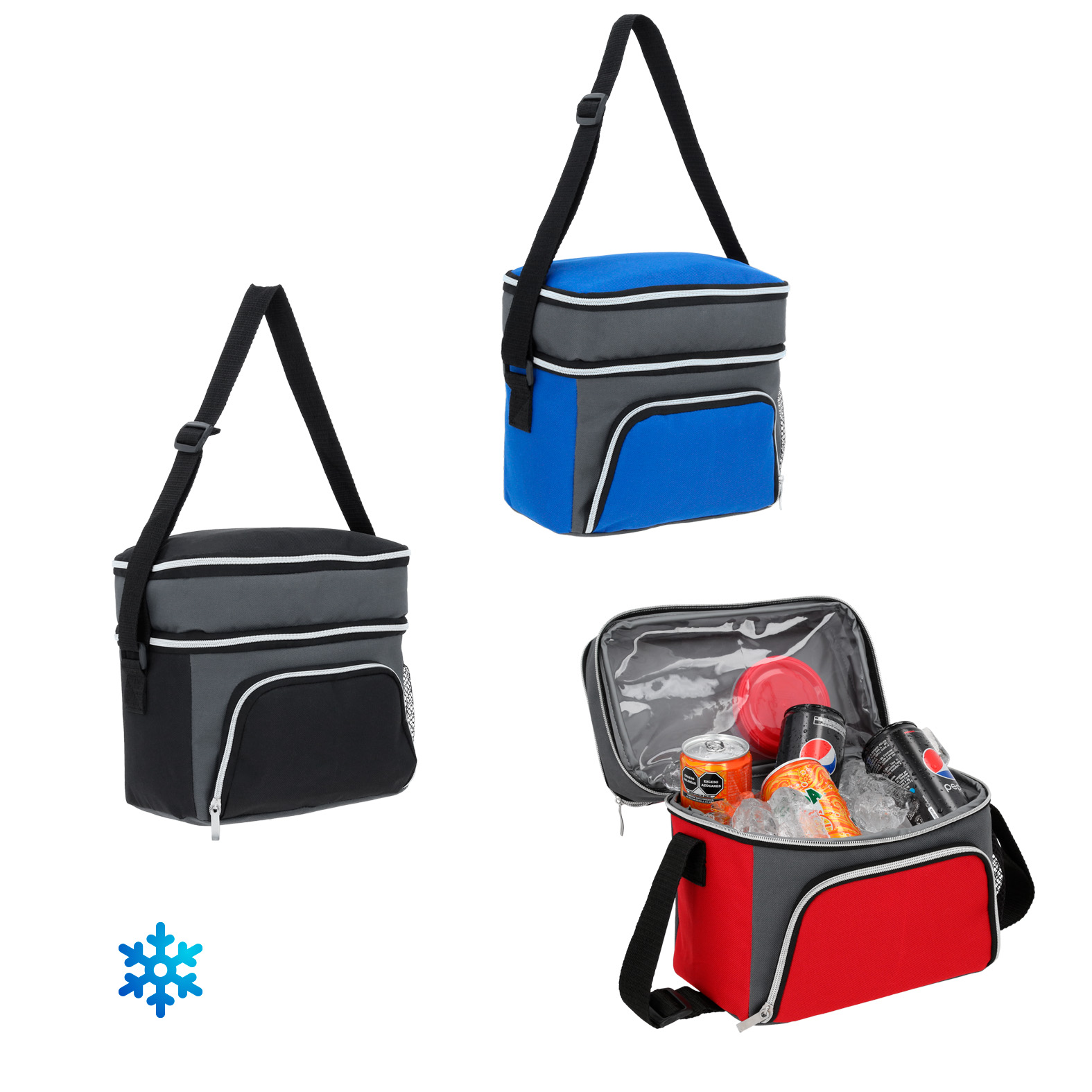 Hielera de 3 compartimentos: 1 compartimento principal plastificado, 1 compartimento en la parte superior, 1 compartimento externo al frente, 1 malla lateral, cierres y correa ajustable.