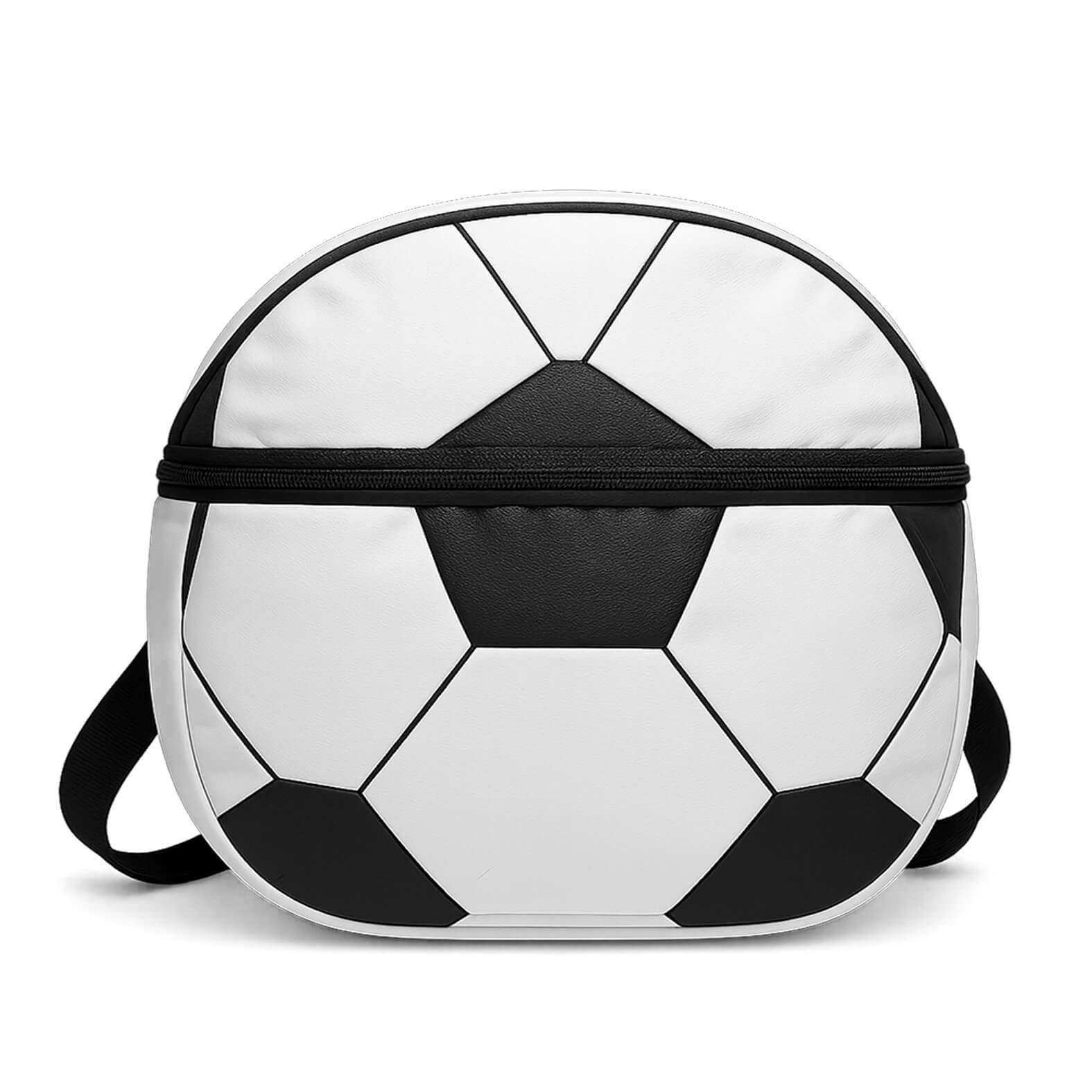 Hielera de poliéster con interior impermeable plástificado, compartimento con cierre en la parte frontal, correa ajustable y print de balón de soccer.