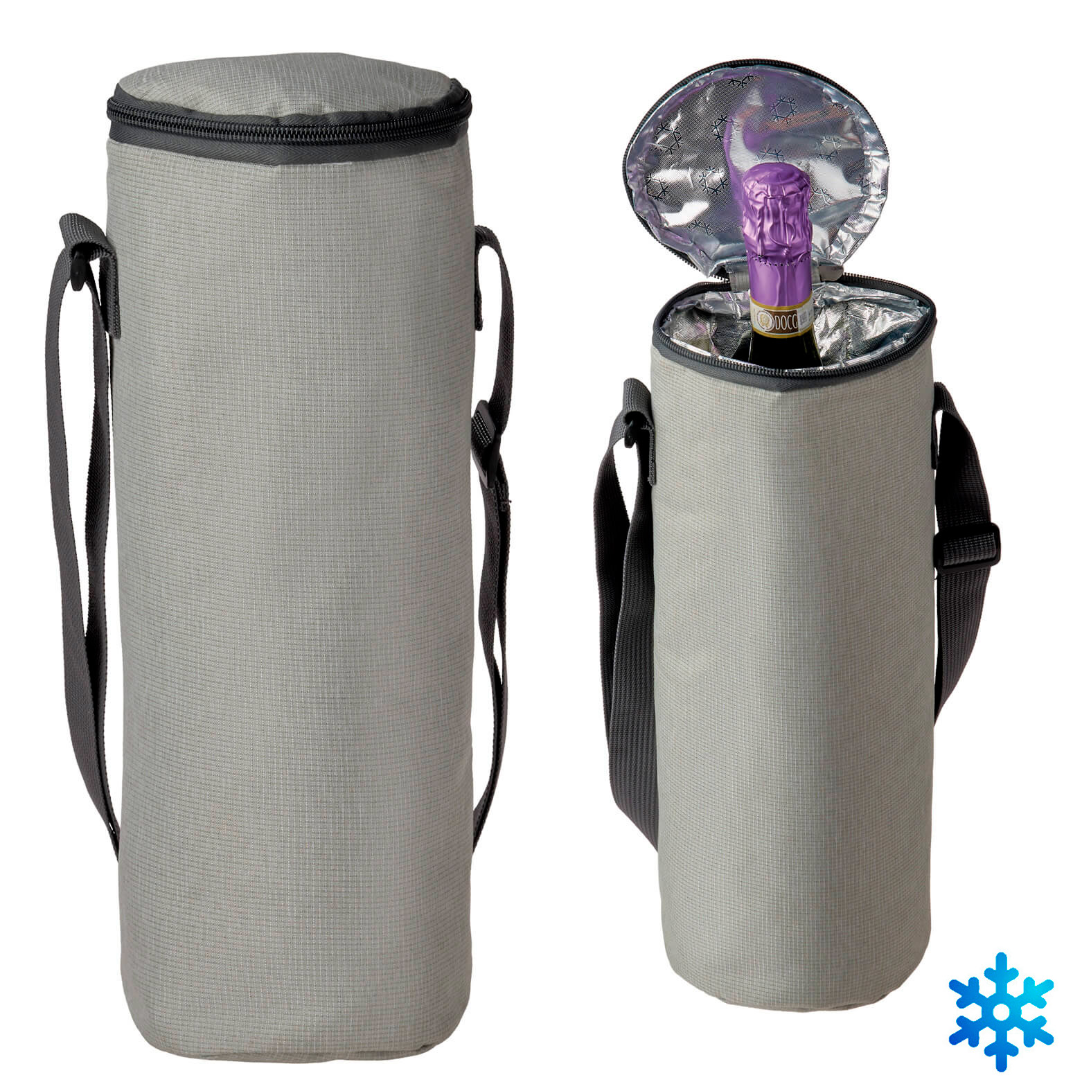 Portavino termico resistente con interior metalizado, cierre y correa ajustable.