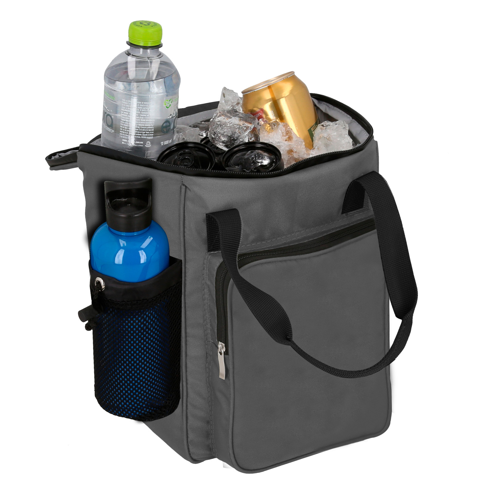 Hielera con interior plastificado, sellado en compartimento principal, un compartimento secundario con cierre, malla lateral y asas superiores.