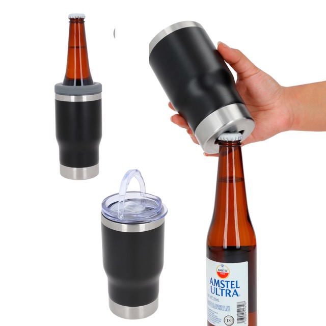 Termo con doble pared de acero inoxidable, acabado rugoso, base con destapador y tapa enroscable intercambiable, sirve como porta latas y porta botellas.