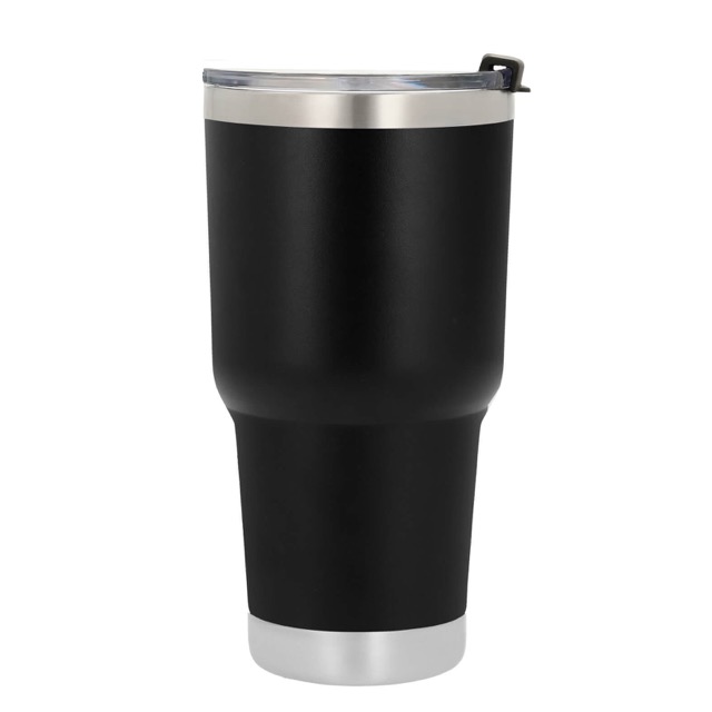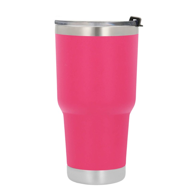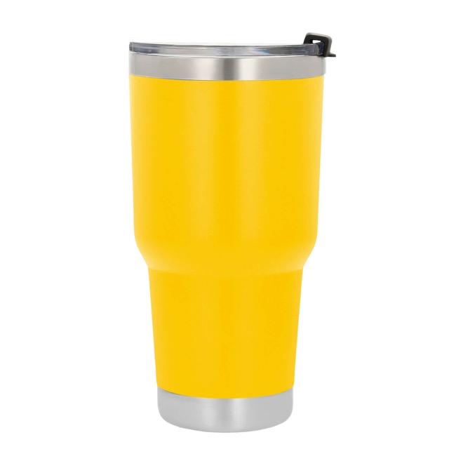 Termo con doble pared de acero inoxidable insulado al vacío con acabado rugoso. Incluye tapa transparente de cierre a presión.