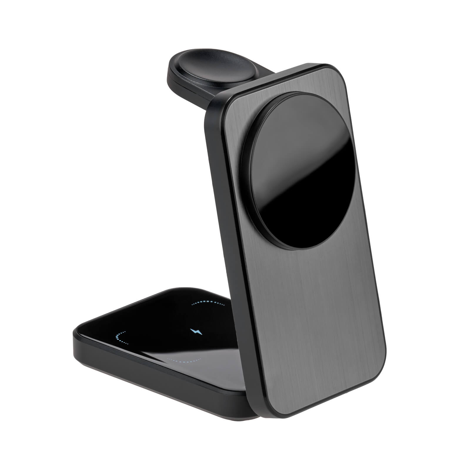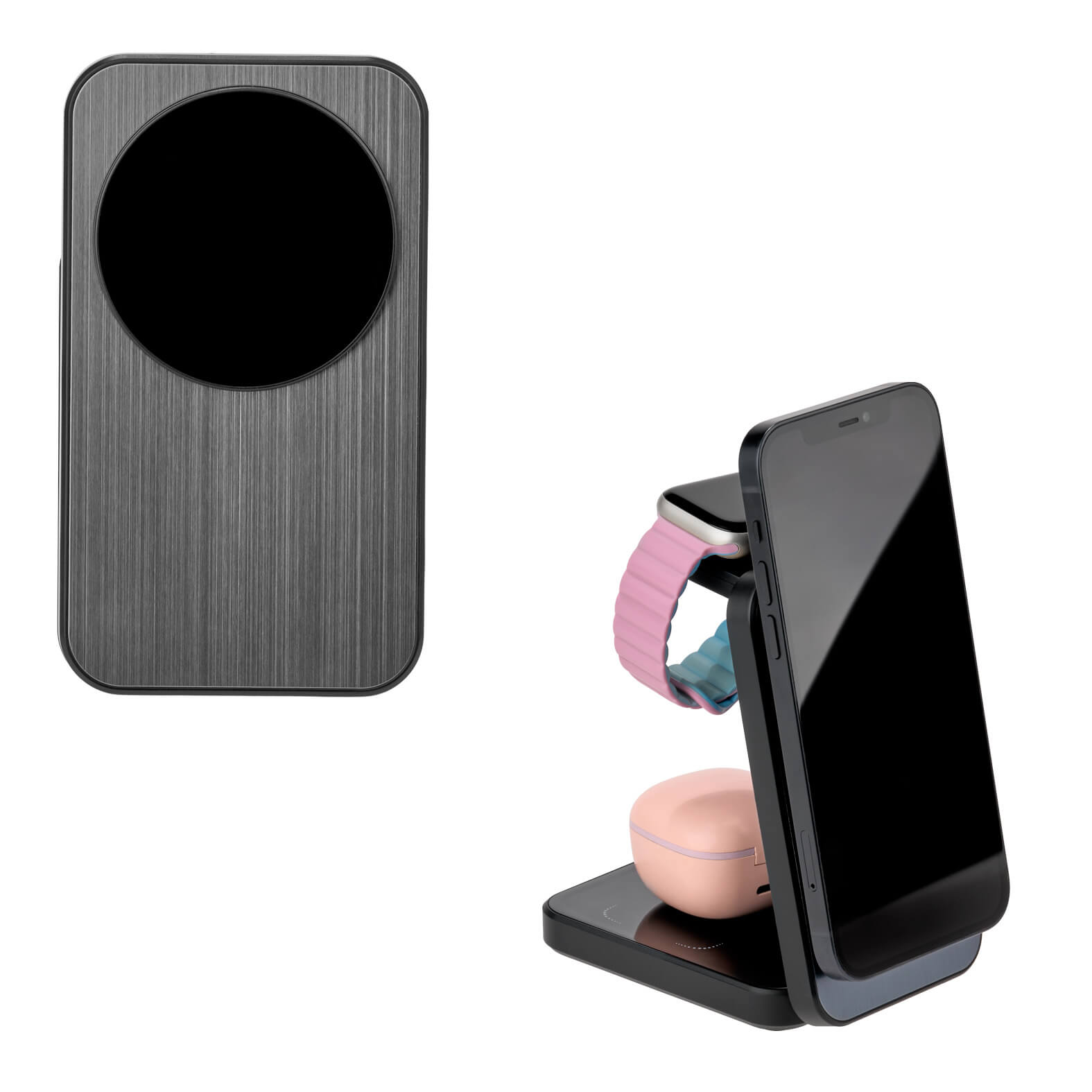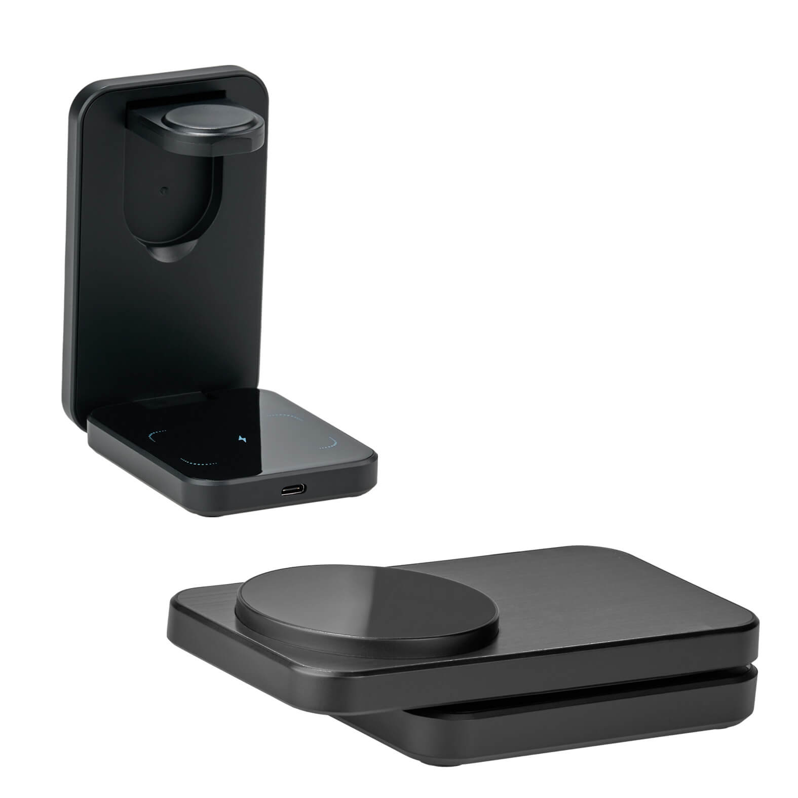 Multicargador inalámbrico plegable 3 en 1 para smartphone, audífonos y reloj inteligente. Cuenta con cable de carga Tipo C. (Compatible con dispositivos con tecnología Qi).