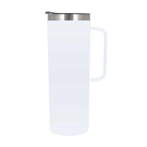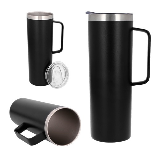 Termo con doble pared de acero inoxidable insulado al vacío. Incluye una tapa transparente de cierre a presión con seguro deslizable, asa y un acabado rugoso.