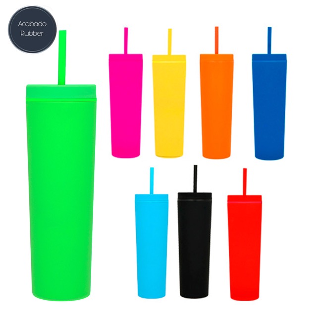 Termo de plástico con doble pared, tapa enroscable y acabado rubber. Incluye popote de plástico.