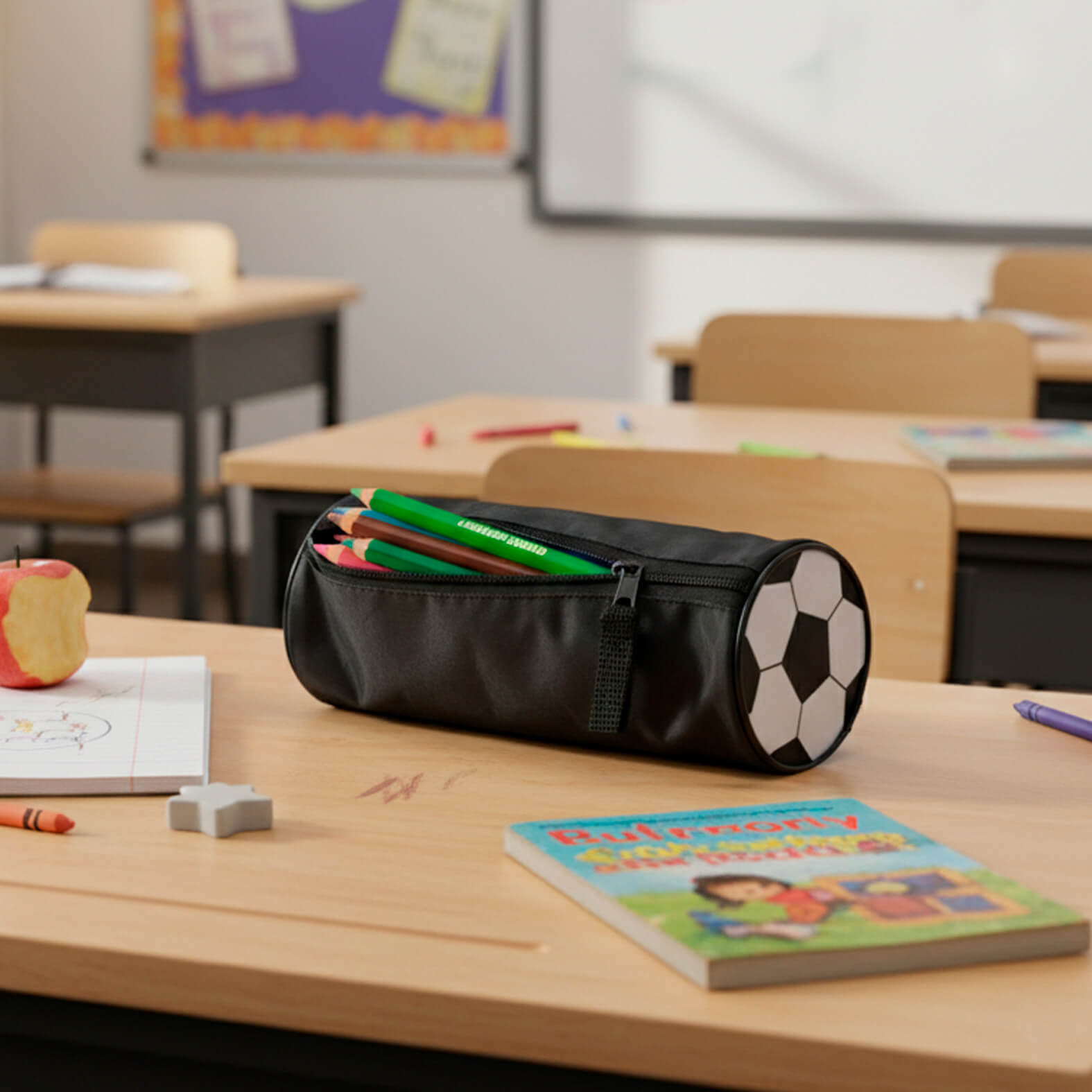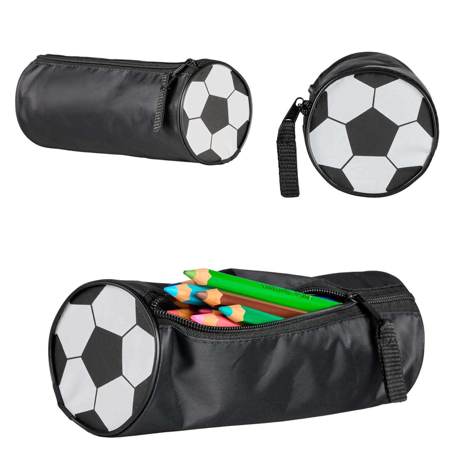 Lapicera de poliéster con print de balón en los laterales y cierre.
