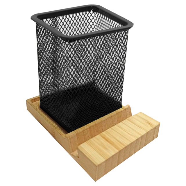 Lapicero de metal con base de bambú que incluye ranura para porta celular.