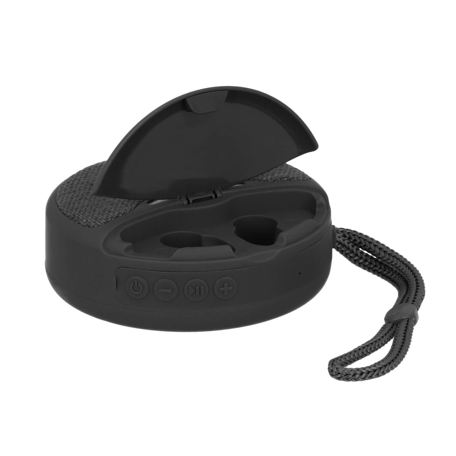 Bocina bluetooth portátil con acabado rubber, puerto micro SD, auxiliar, USB, audífonos y cable de carga tipo C.