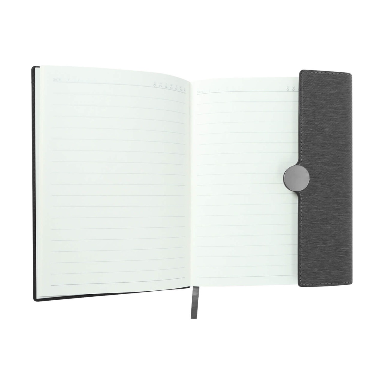 Libreta de poliuretano con 120 hojas de raya, separador y broche magnético.