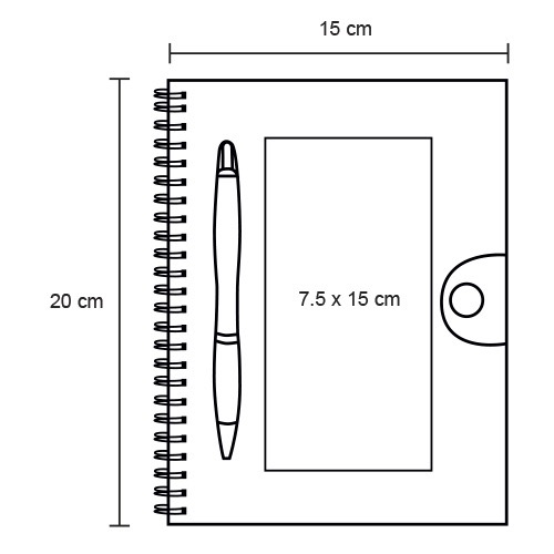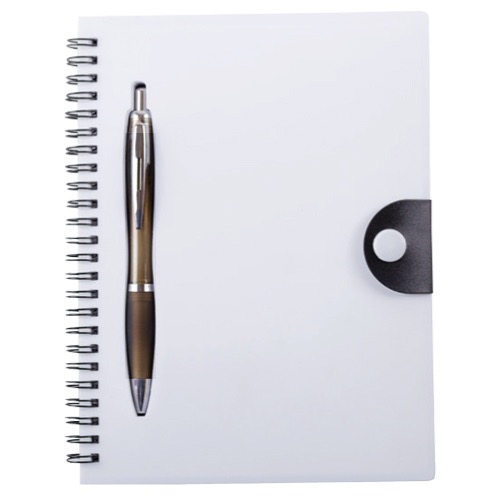 Libreta de 80 hojas, cubierta de plástico, espiral metálico y bolígrafo.
