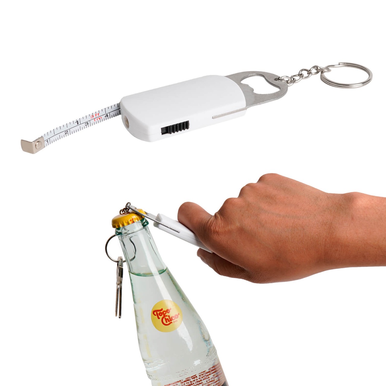 Llavero multifuncional, con destapador, lampara, flexometro y aro reforzado.