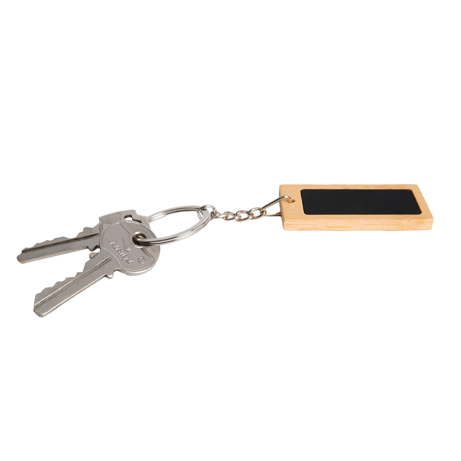 Llavero de bambú rectangular con placa interior con acabado rubber y aro metálico.