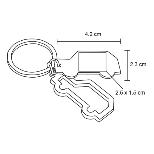 Llavero metálico doble en forma de coche, placa sólida y silueta, con arillo reforzado para colgar.