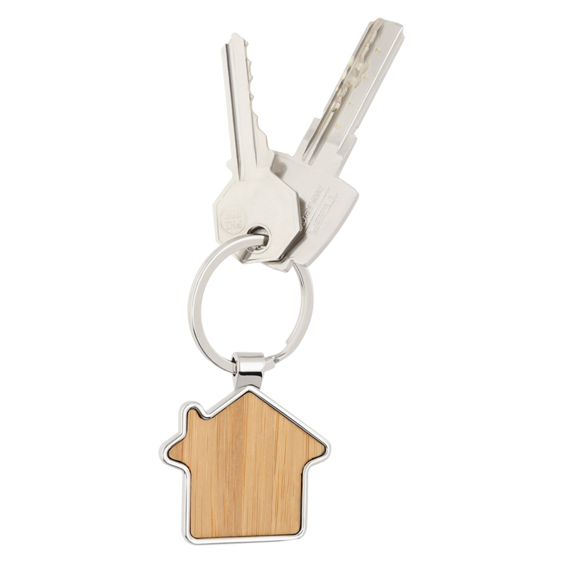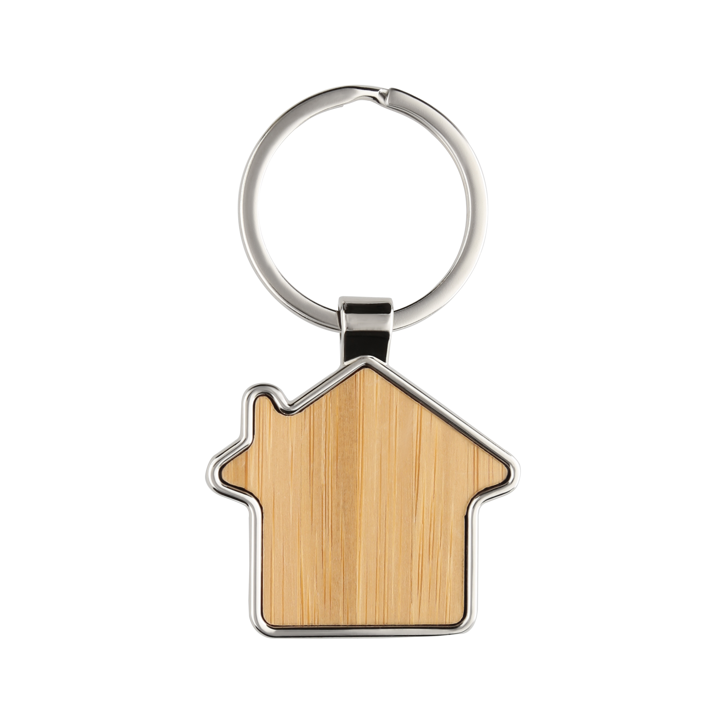 Llavero metálico con frente de madera en forma de casa y arillo reforzado.