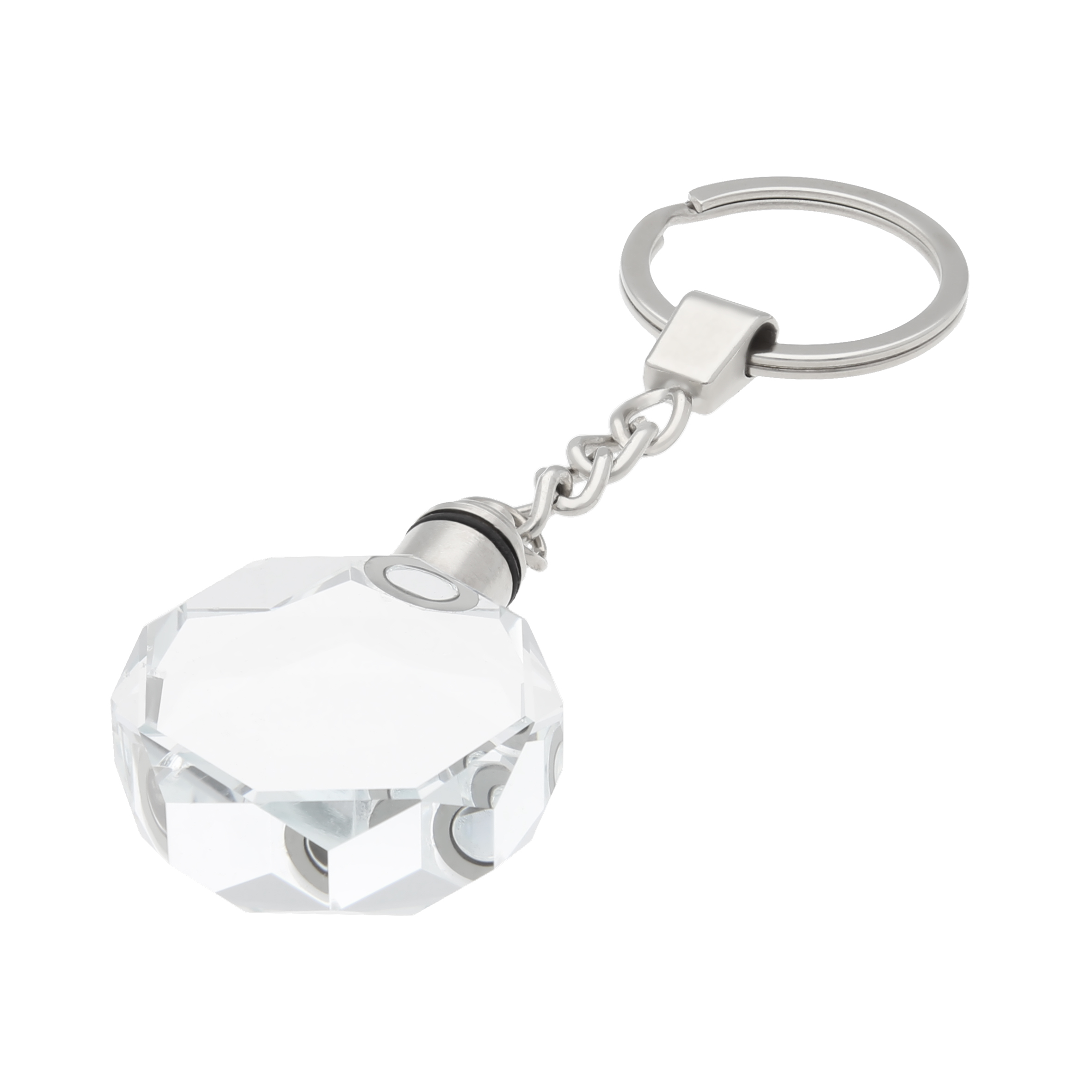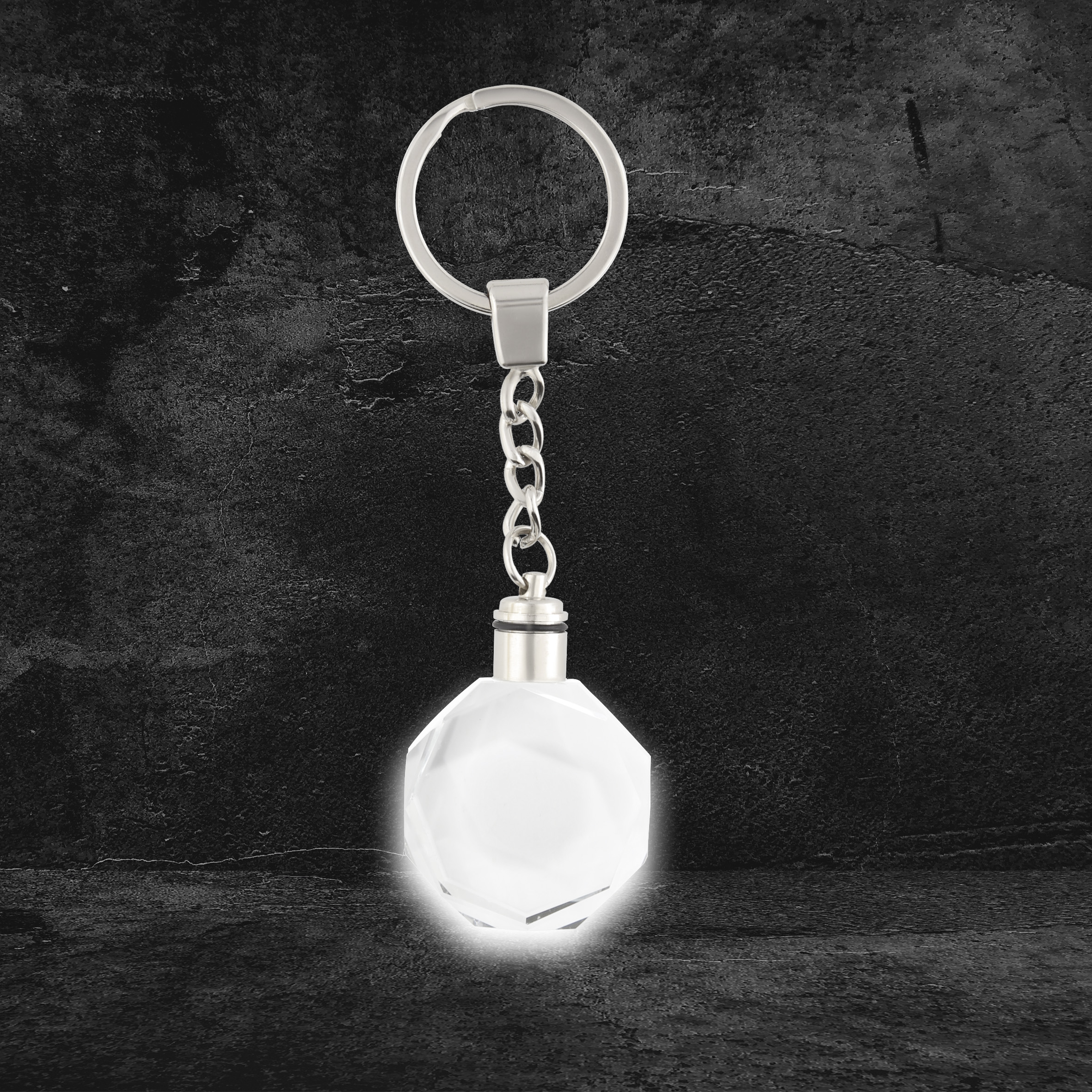 Llavero con diseño en forma de octágono y luz blanca. Incluye 3 baterías AG1.