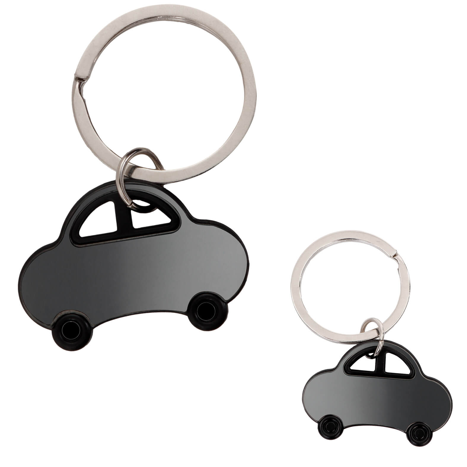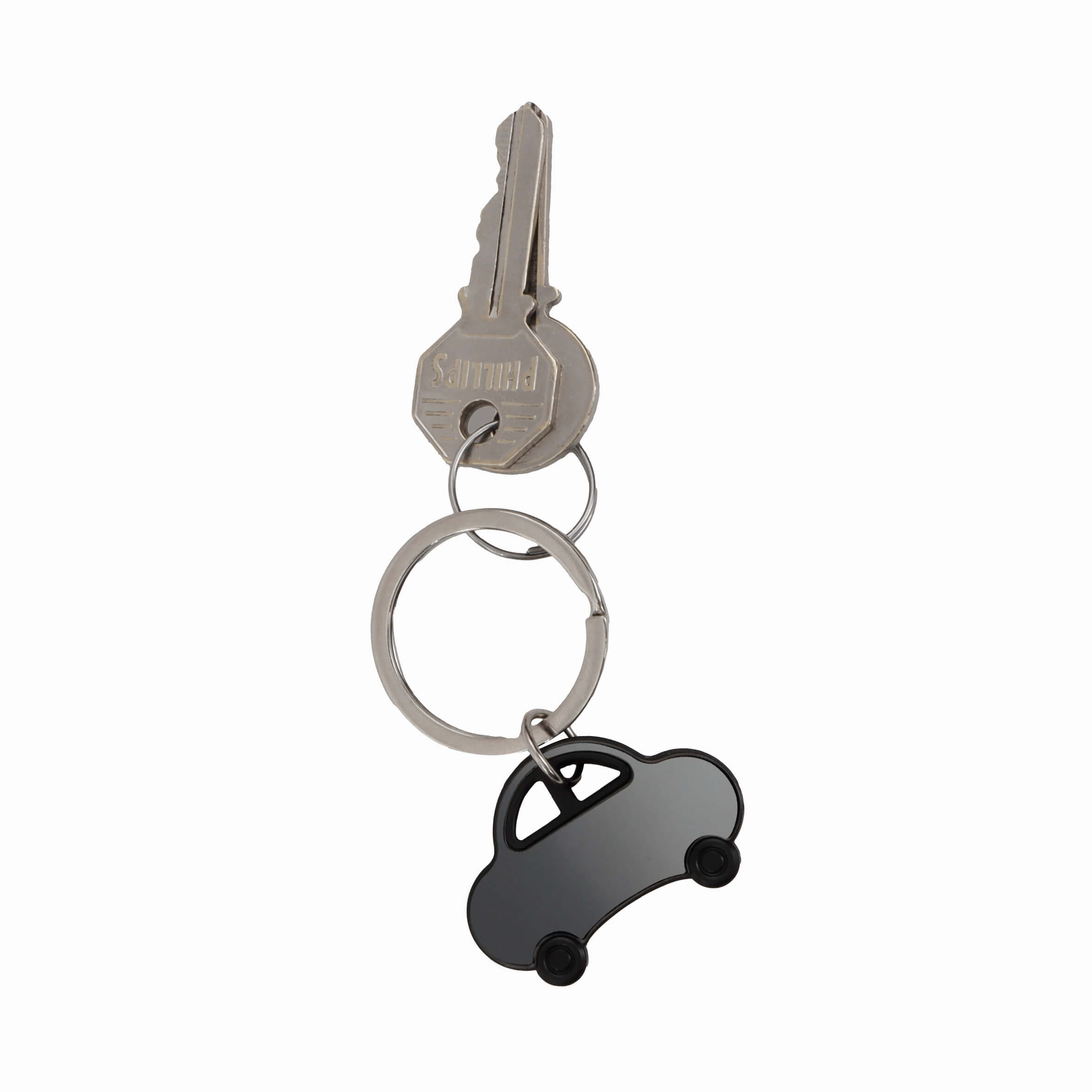 Llavero metálico con diseño en forma de automóvil y acabado espejo.