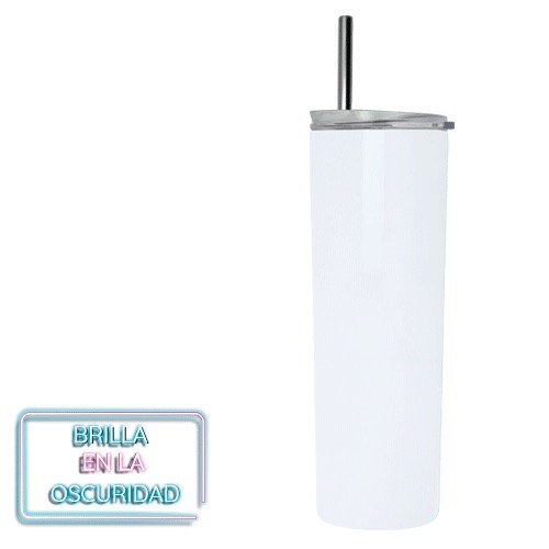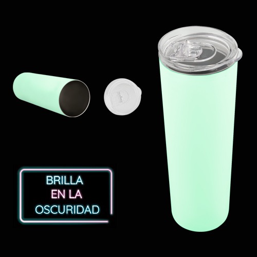 Termo de acero inoxidable con con doble pared insulado al vacío que brilla en la oscuridad. Incluye tapa de plástico a presión con boquilla deslizable y popote de acero inoxidable.