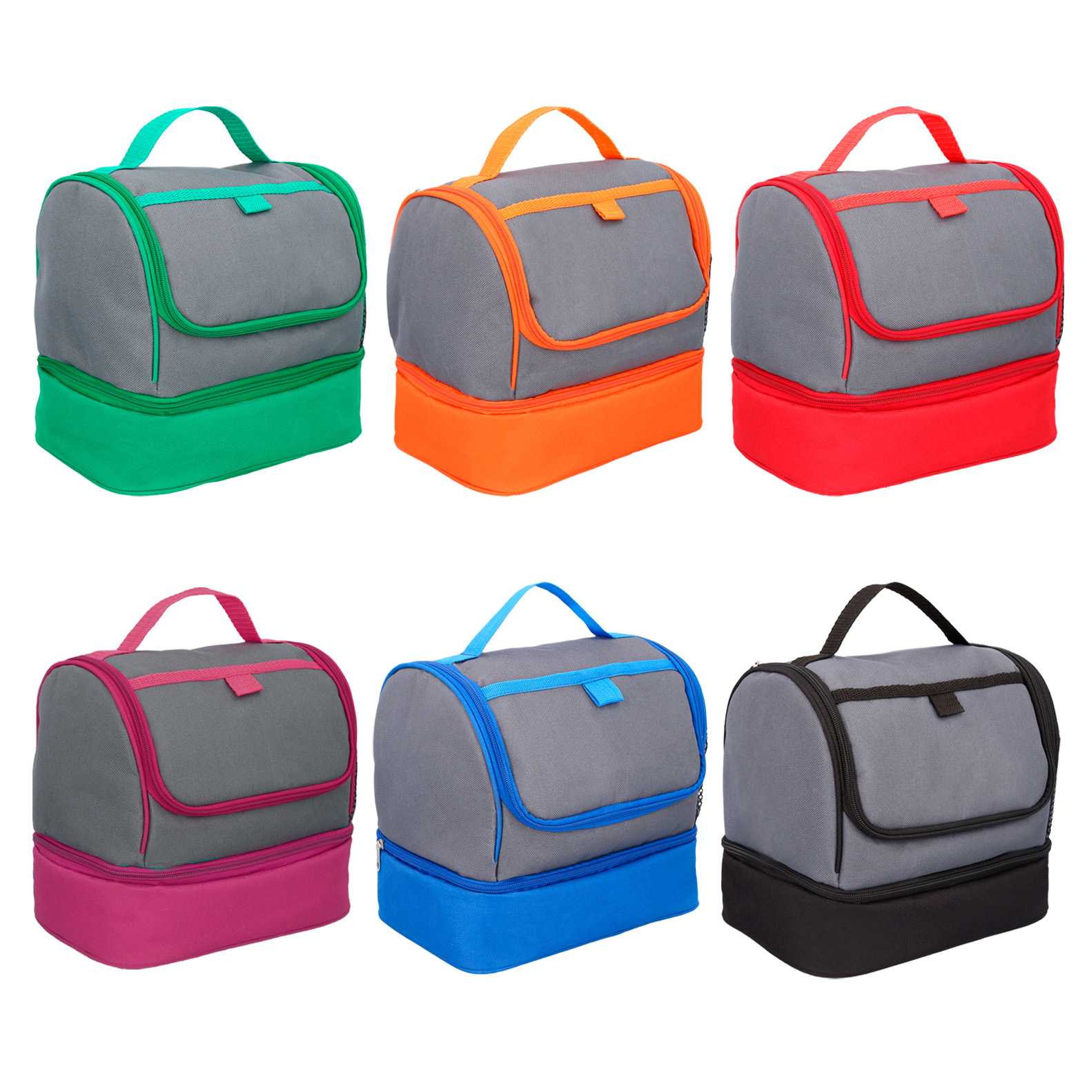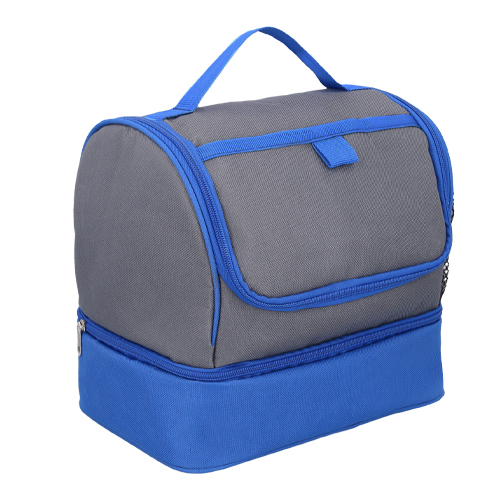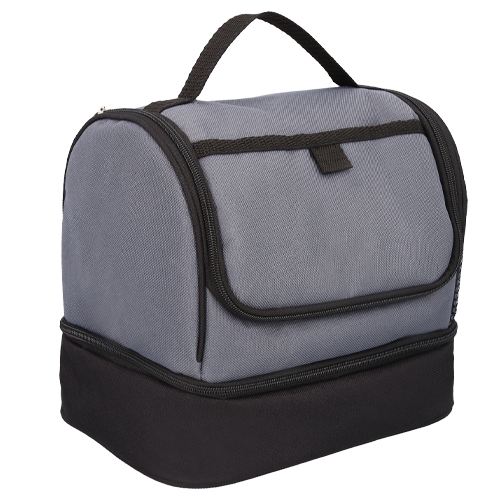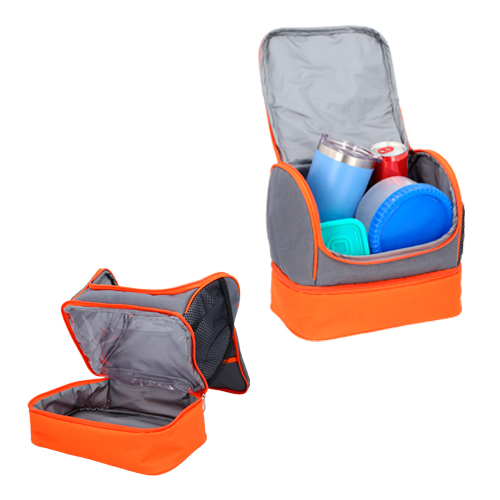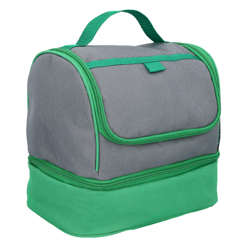 Lonchera con 2 compartimentos, interior impermeable plastificado, asa, un compartimento externo al frente y bolsillo lateral de malla.