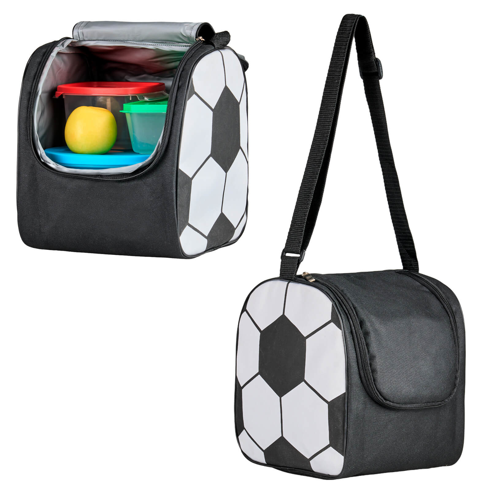 Lonchera con un compartimento, interior permeable, cierre, print de balón de soccer en los laterales y correa ajustable.