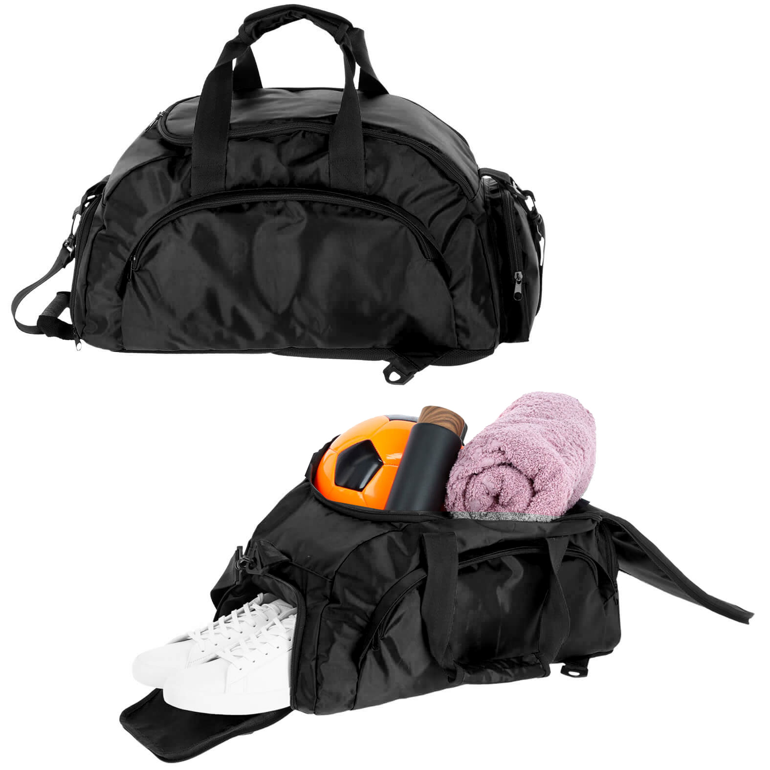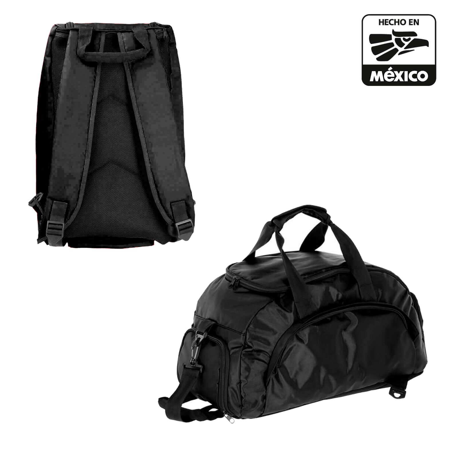 Maleta deportiva que se convierte en mochila, con 2 broches de seguridad ajustables y tirantes acolchonados. Incluye zapatera y dos compartimentos exteriores, asas y correa ajustable.