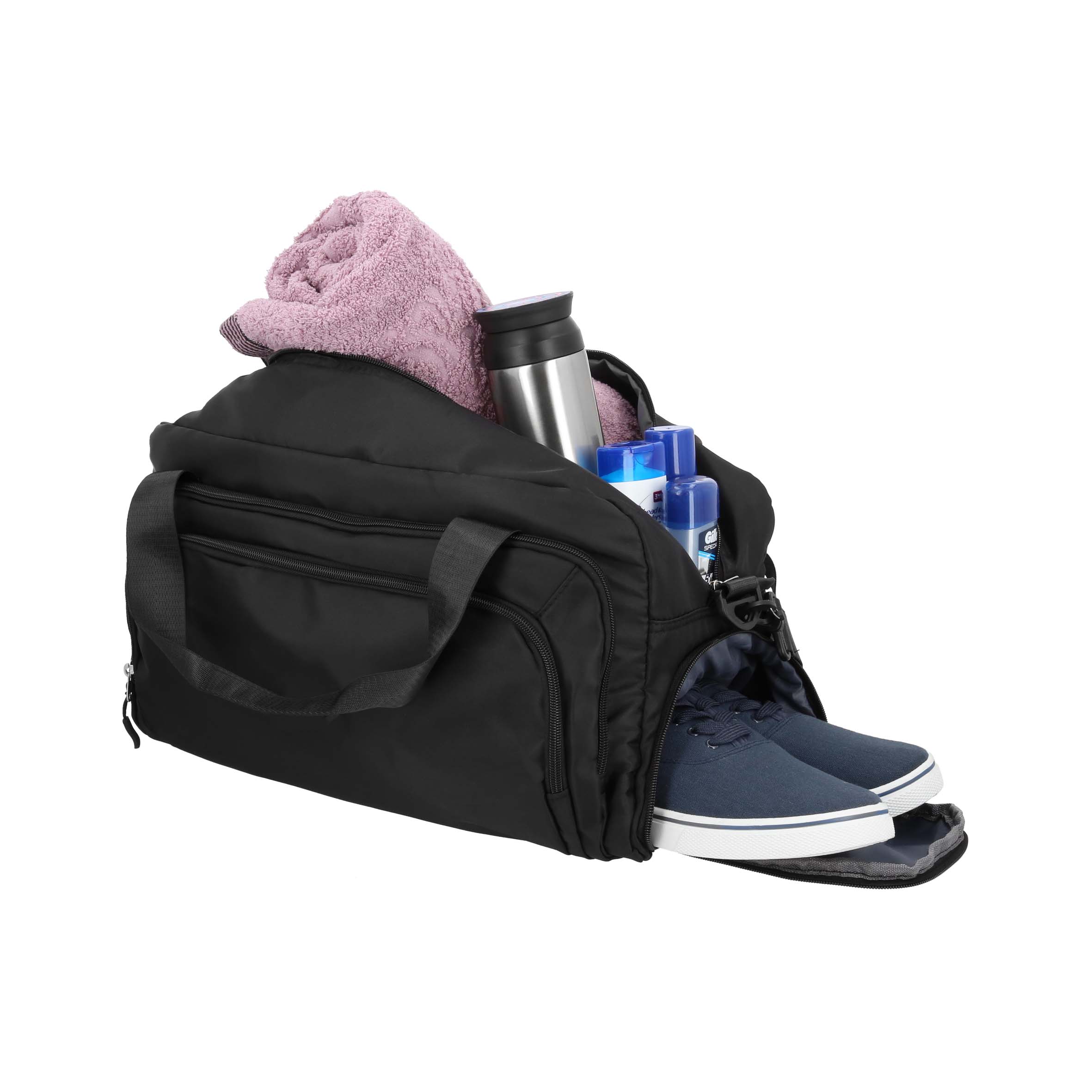 Maleta con 1 compartimento principal, 2 compartimentos frontales, zapatera, 1 compartimento lateral y asas.