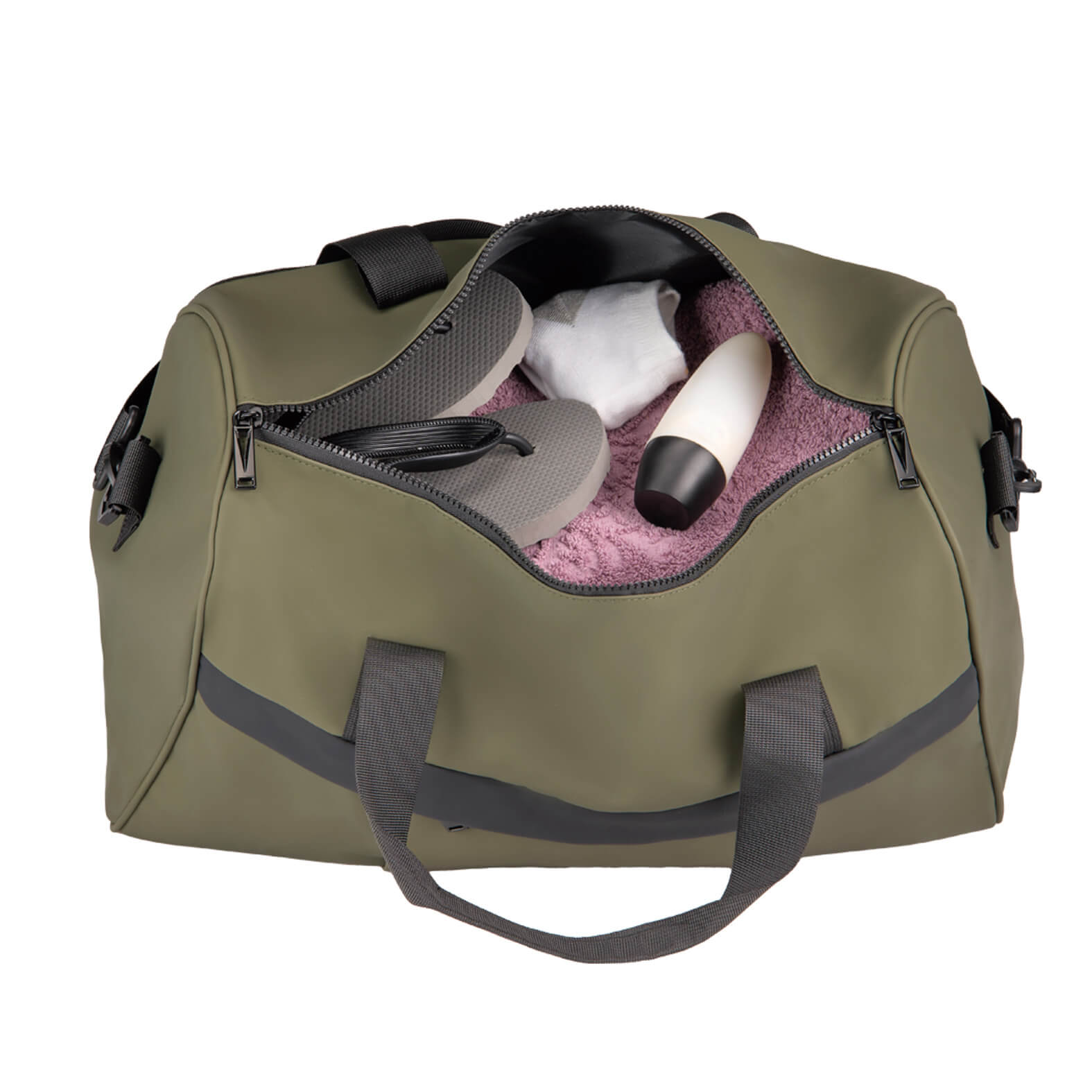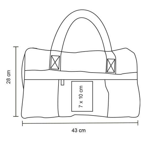 Maleta deportiva con compartimento principal, bolsa frontal con cierre, banda para carry-on, asas y correa ajustable.