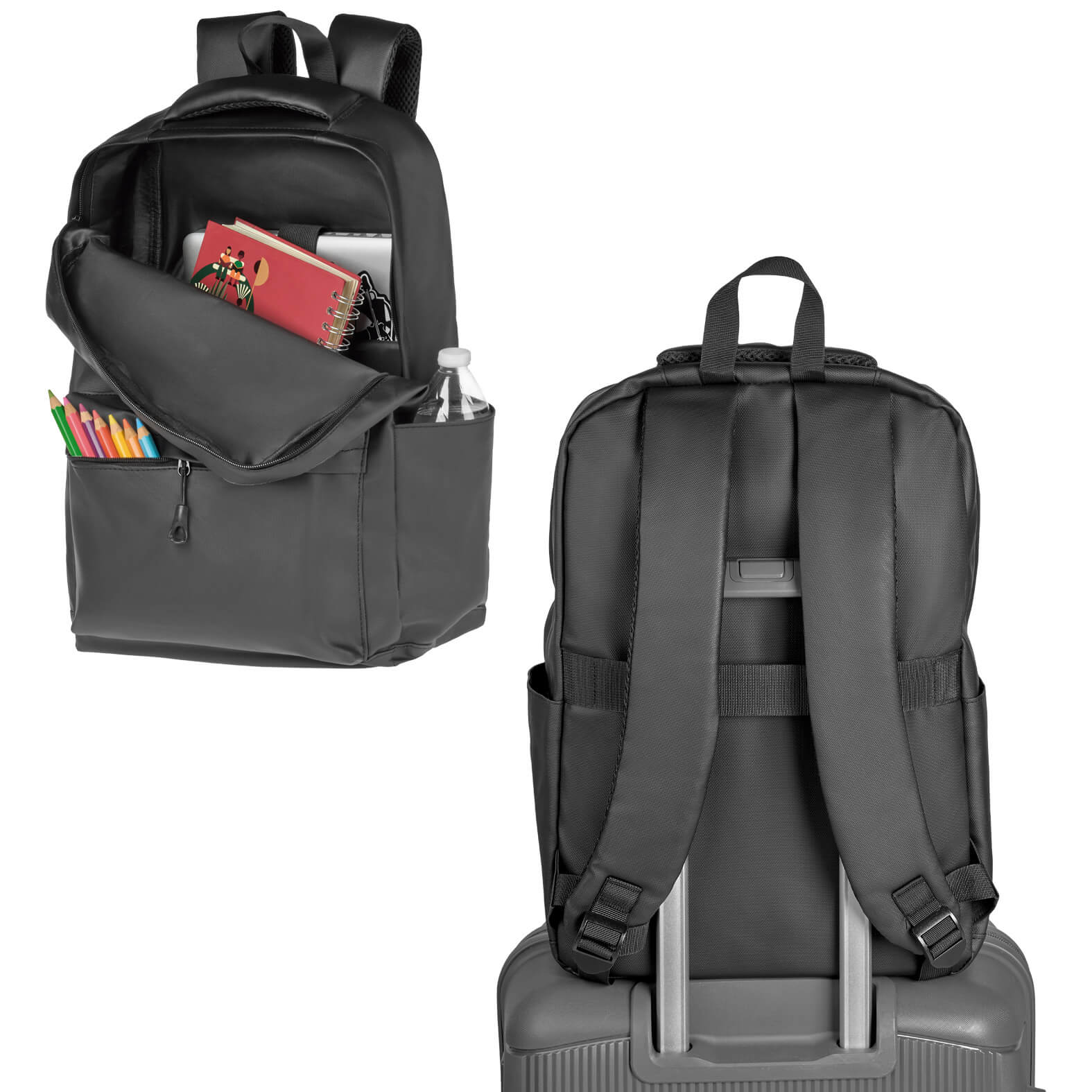 Mochila con compartimento principal con porta laptop de 17″, dos bolsas frontales con cierre, dos bolsas laterales, banda carry-on y asa superior.