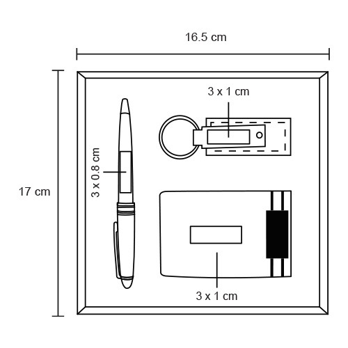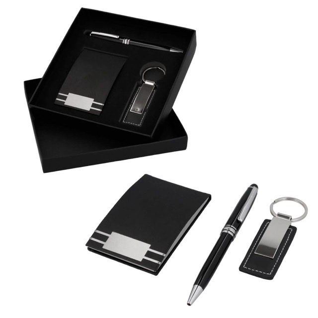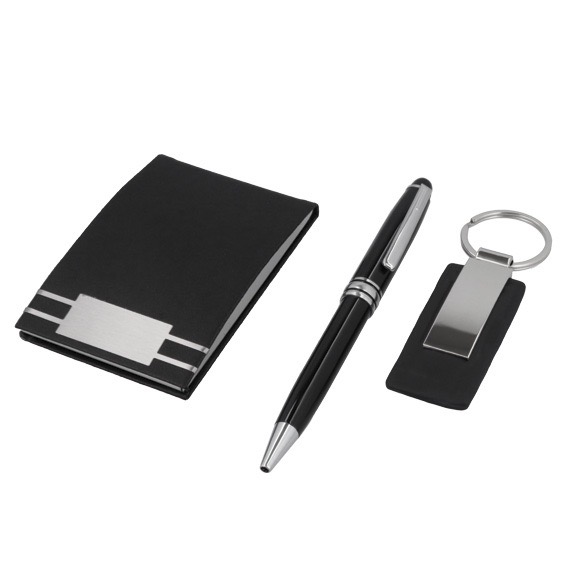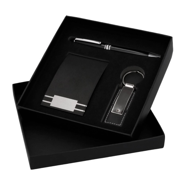 Set ejecutivo: Incluye llavero metálico y curpiel, tarjetero, bolígrafo metálico y estuche de regalo.