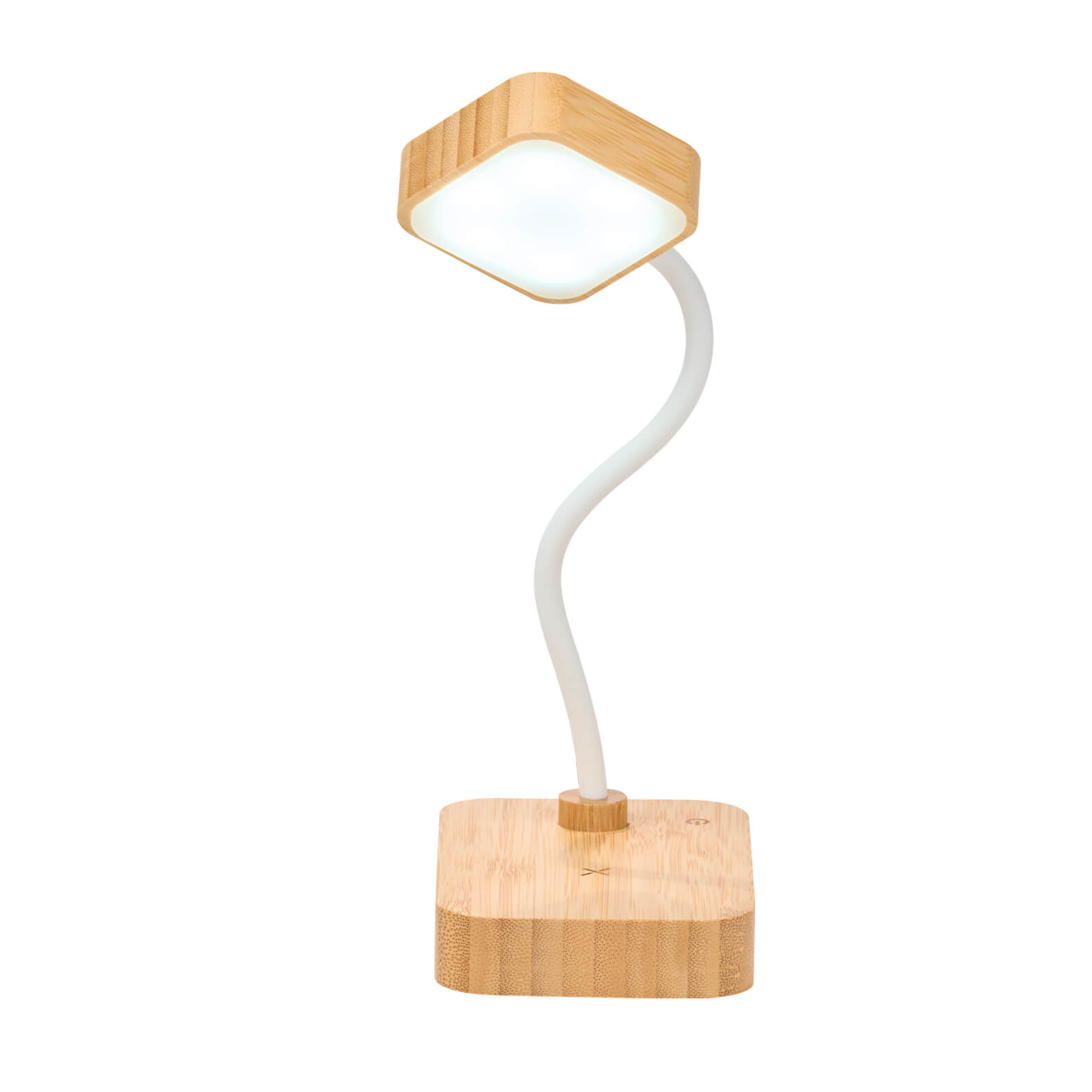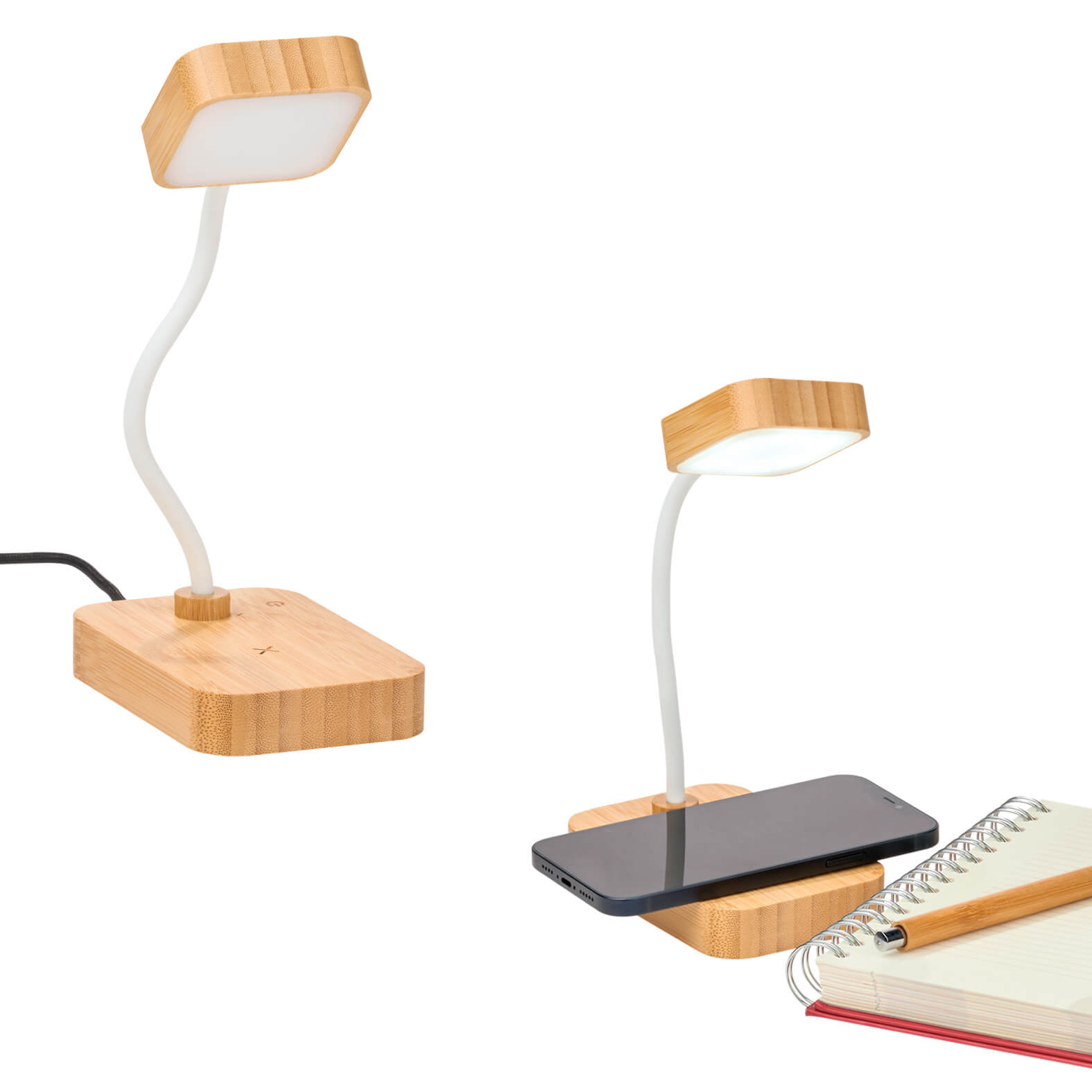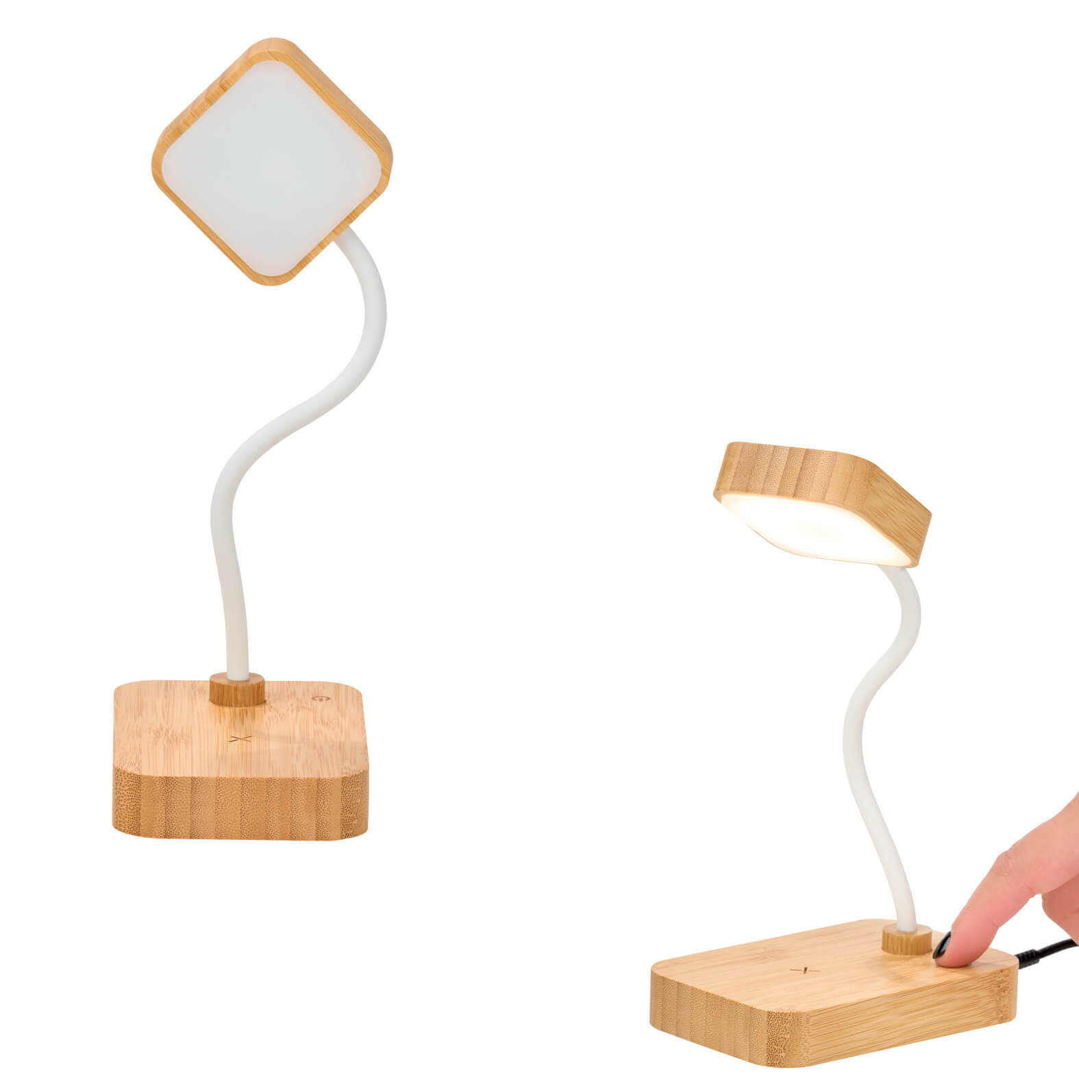 Cargador inalámbrico de bambú con lámpara y botón touch con tres modalidades. Incluye cable de carga Tipo C. (Compatible con dispositivos con tecnología Qi).